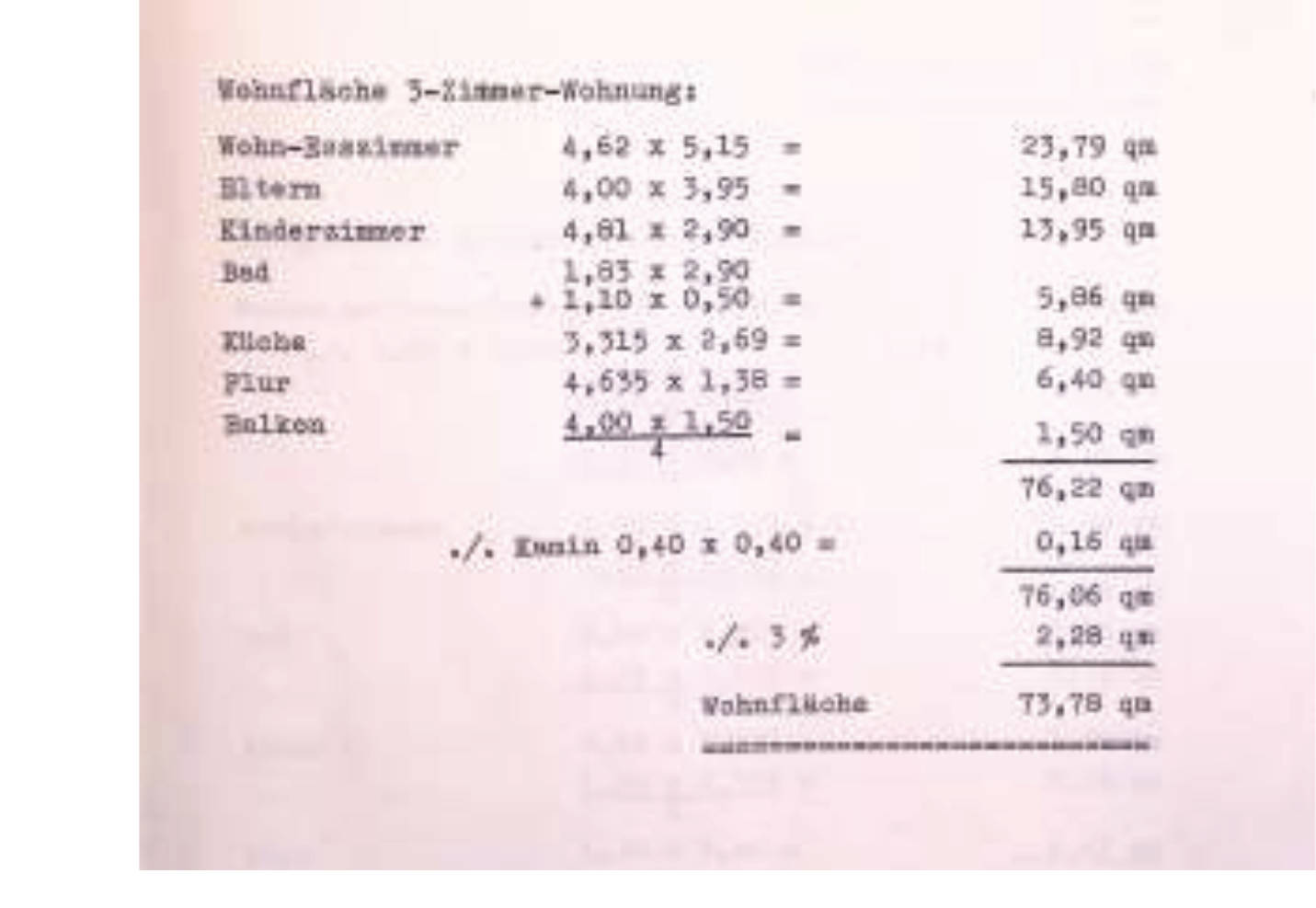 Die zu versteigernde Einheit ist eine 3-Zimmerwohnung im Erdgeschoss links eines sieben Parteien umfassenden Mehrfamilienhauses. Sie hat eine Wohnfläche von ca. 74 m² und umfasst Flur, Küche, Bad, Kinderzimmer, Elternschlafzimmer, Wohn-Esszimmer und einen Balkon. Zusätzlich besteht ein Mansardenzimmer im Dachgeschoss (ca. 8 m², zur Nutzung der Wohnung zugeordnet), ein Keller- sowie ein Abstellraum im Untergeschoss.