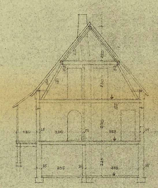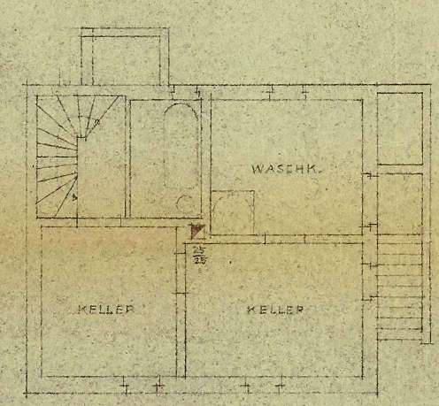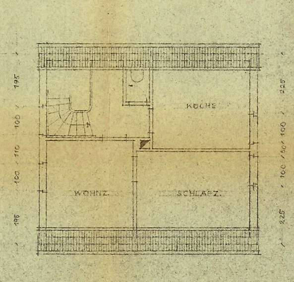 Das Einfamilienwohnhaus, Baujahr 1956, ist voll unterkellert, eingeschossig mit ausgebautem Dachgeschoss und einem Satteldach mit Schleppgaube, die nach Nordosten zeigt. Die Wohnfläche beträgt ca. 82 m²: ca. 45 m² im Erdgeschoss und ca. 36 m² im Dachgeschoss. Die Grundrissgestaltung sieht im Erd- und Dachgeschoss jeweils eine 2-Zimmer-Einheit mit Küche und WC vor; im Dachgeschoss existiert jedoch keine Küche, lediglich ein Badezimmer wurde nachträglich eingebaut. Die Wohnräume werden jeweils vom Flur über das zentrale Treppenhaus erschlossen, jeweils ein Raum ist ein gefangener Raum. Im Keller befinden sich zwei Kellerräume, Waschküche und Heizungsraum auf etwa 45 m² Nutzfläche.