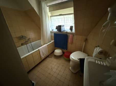 Sanitärausstattung: WC im EG (ca. 1990er Zustand), Badezimmer mit Badewanne, WC und Waschbecken im DG (Altzustand ca. 1960/1970)