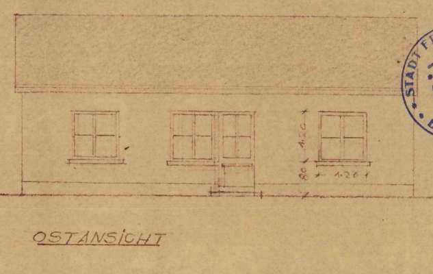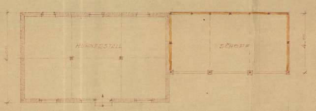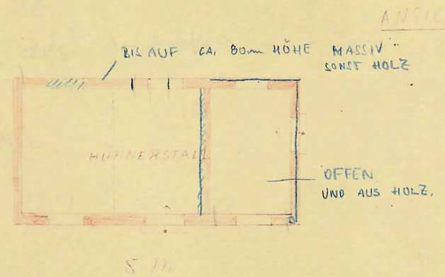 Im südwestlichen Grundstücksteil befinden sich laut Planunterlagen ein Hühnerstall und ein Schuppen, vermutlich aus der Bauzeit und ebenfalls in sehr schlechtem Zustand. Die Dächer sind mit asbesthaltigen Welleternitplatten gedeckt. Eine Besichtigung war nicht möglich; die Bewertung erfolgte nach Aktenlage.