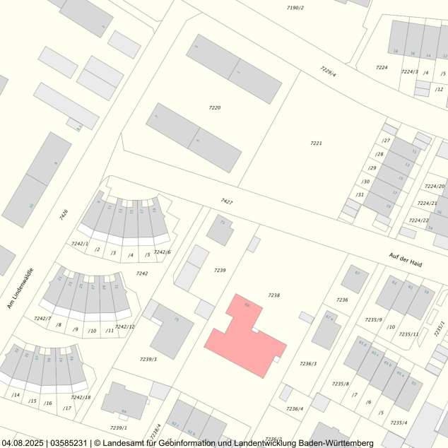 Das Grundstück misst 659 m² und hat einen annähernd rechteckigen Zuschnitt, mit einer Frontbreite von etwa 20 m zur Straße und einer mittleren Tiefe von ca. 33 m. Die Topografie ist eben, die Oberflächen entsprechen einem normalen Wohnbaugrund, jedoch ist der Gartenbereich stark verwildert. Die Erschließung ist vollständig, ein PKW-Stellplatz ist auf dem Grundstück vorhanden. Ein Hochspannungsmast verläuft in niedriger Höhe zentral über das Grundstück.