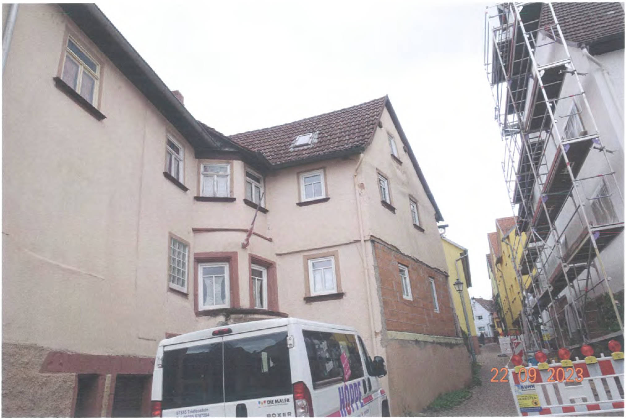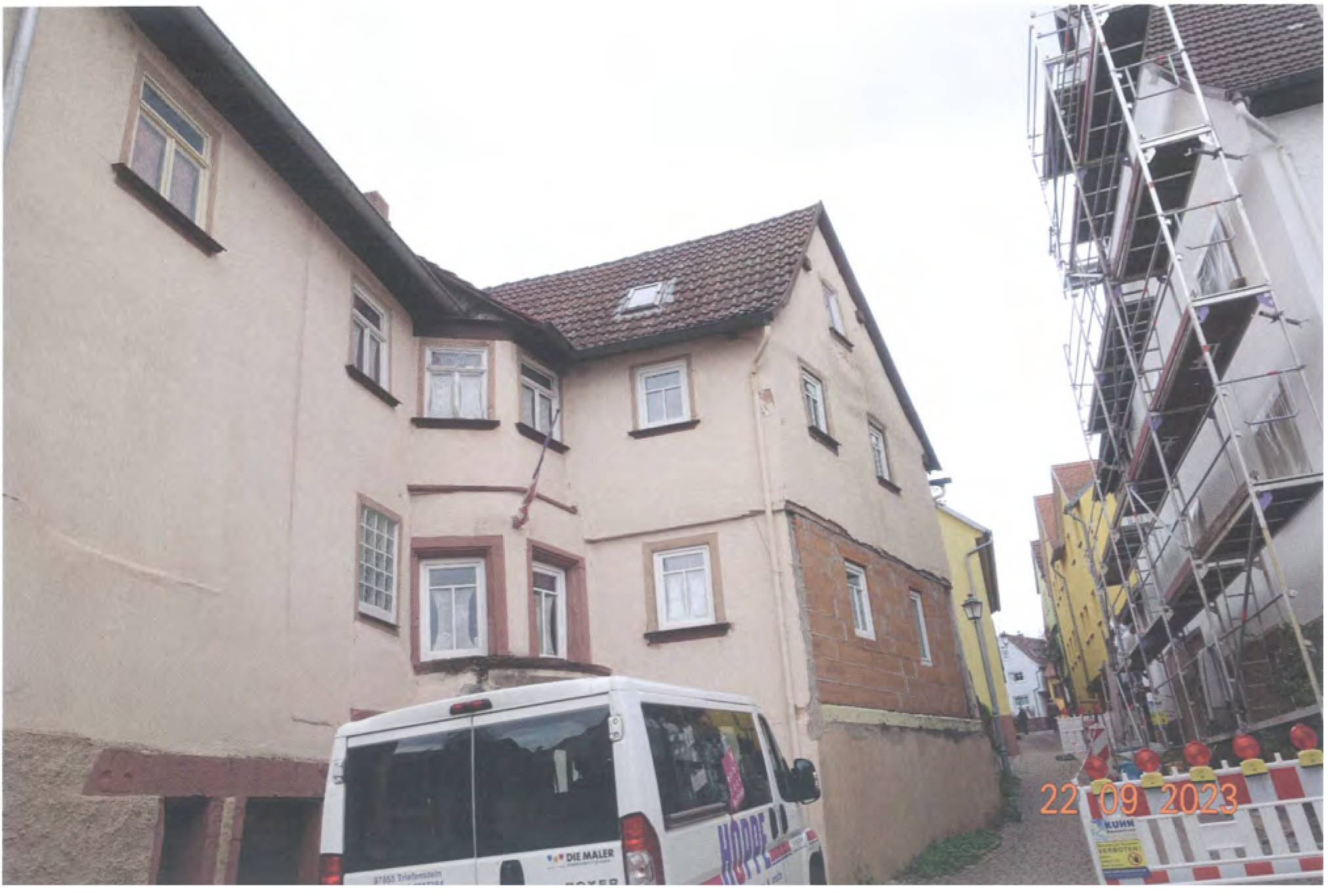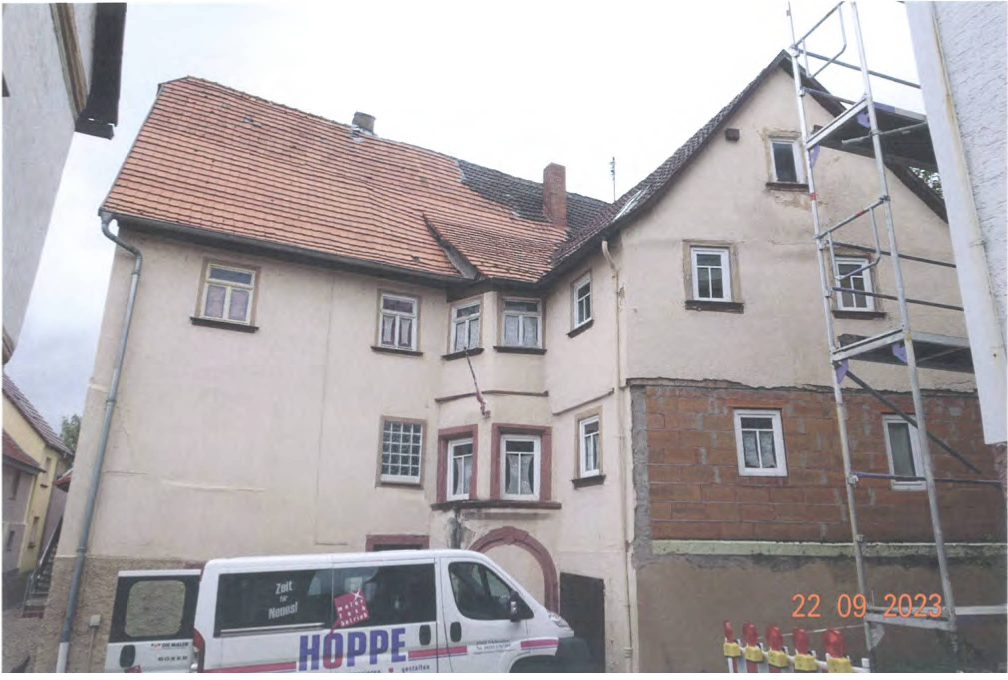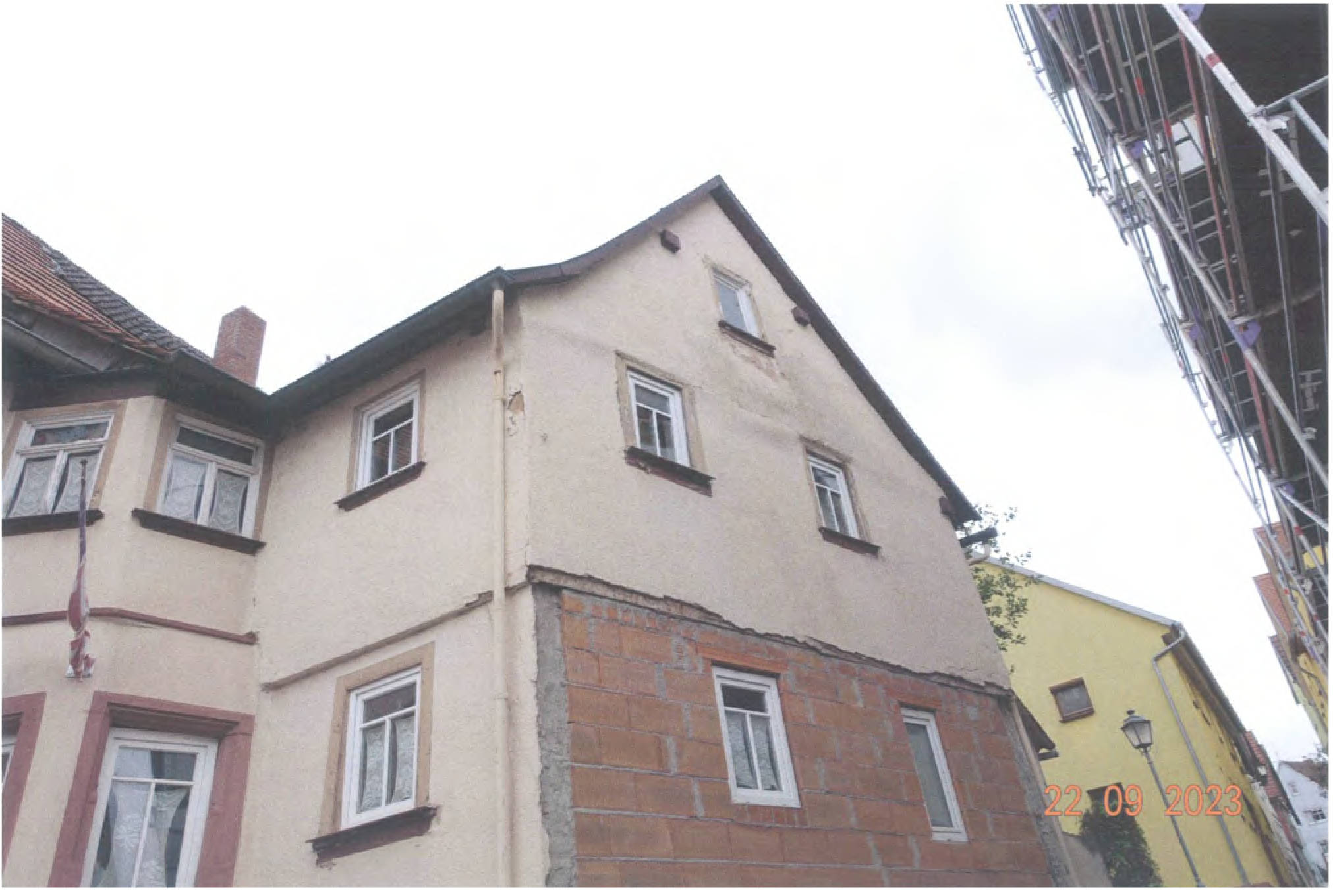 Gemäß Außenansicht diverse Bauschäden bzw. -mängel: großflächige, auf Feuchtigkeitseinwirkung hindeutende Erscheinungen, schwere Putzschäden, massive Rissbildungen, Materialzersetzungen/Materialausbrechungen, teils stark eingesunkene Dachflächen, usw.