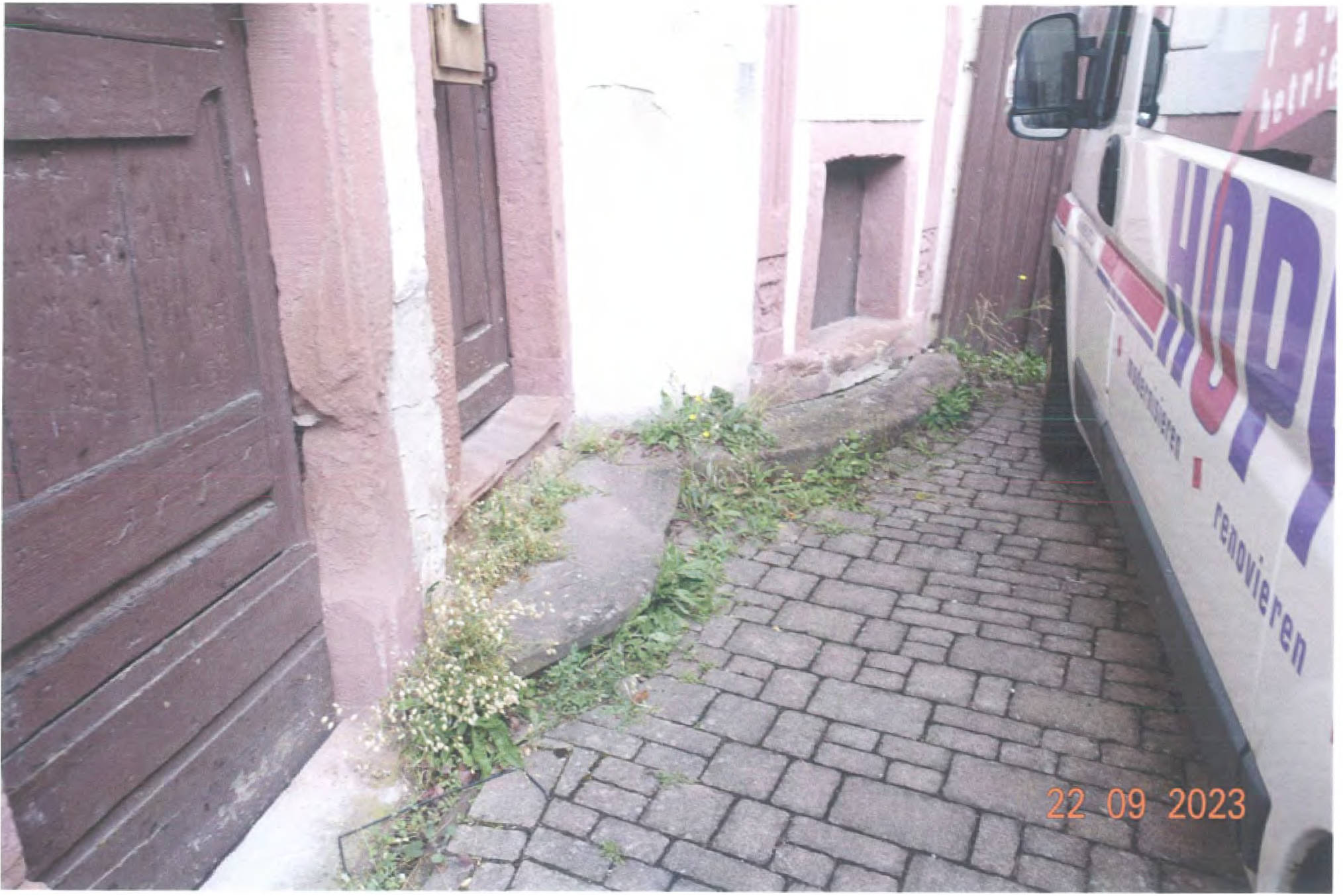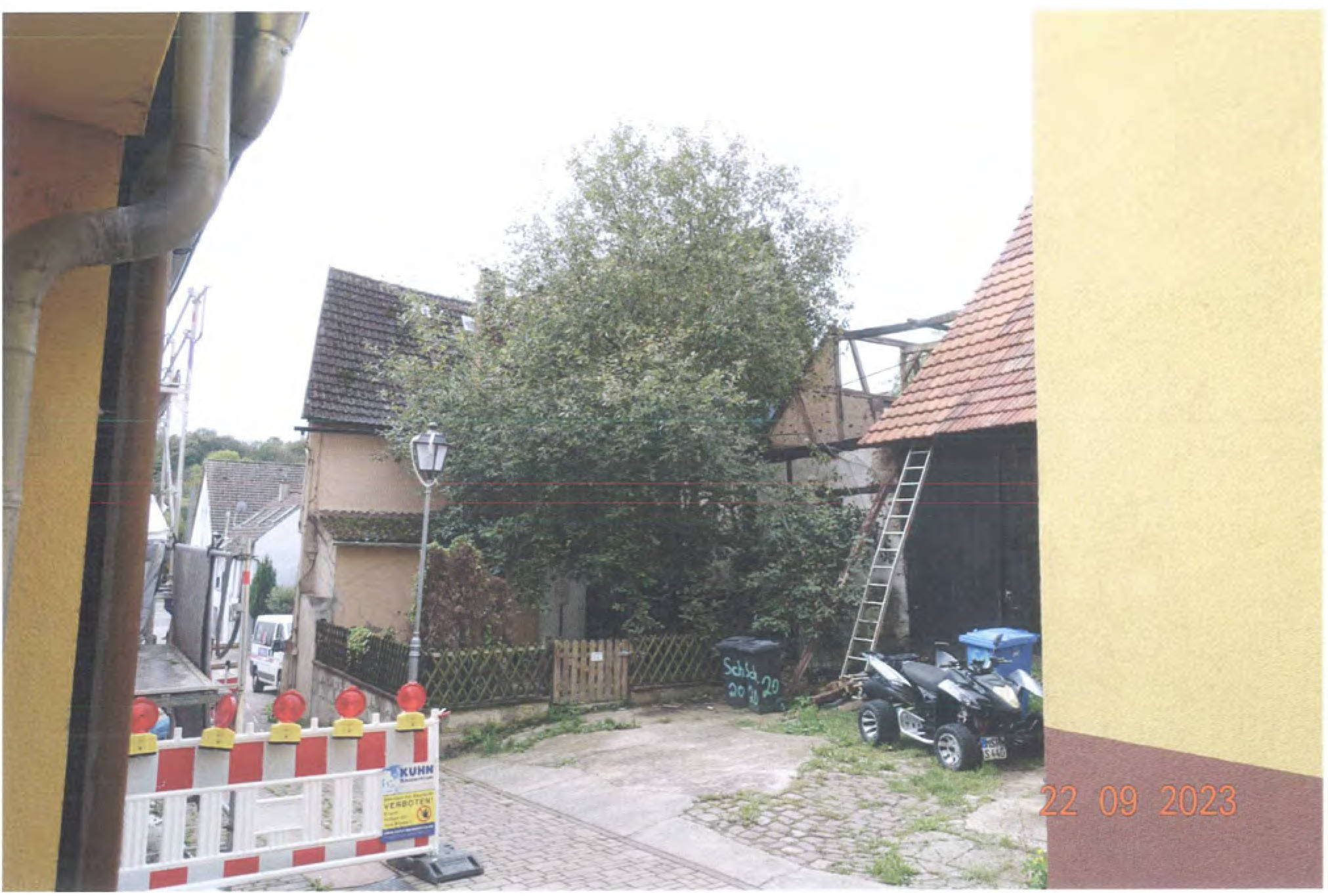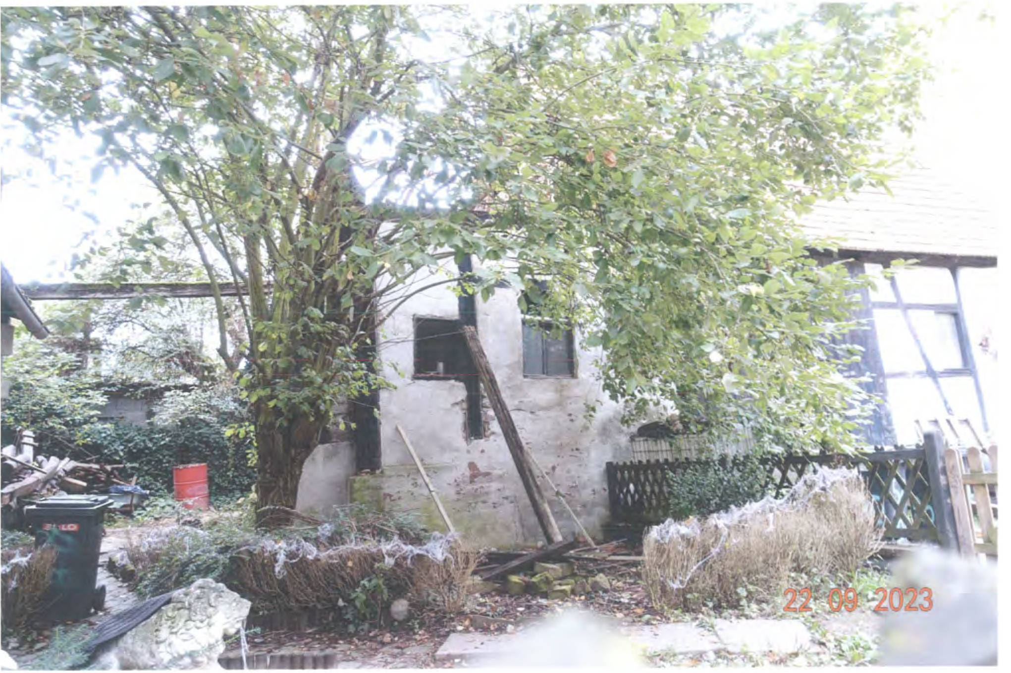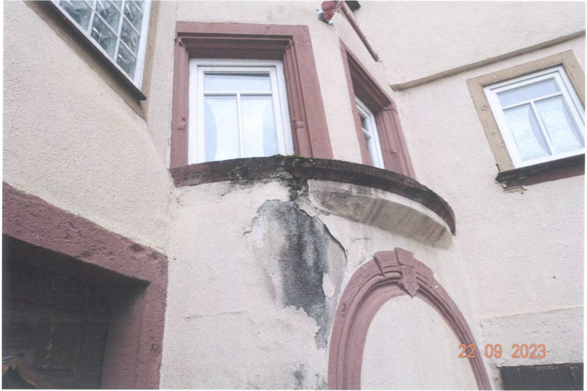 Gemäß Außenansicht diverse Bauschäden bzw. -mängel: großflächige, auf Feuchtigkeitseinwirkung hindeutende Erscheinungen, schwere Putzschäden, massive Rissbildungen, Materialzersetzungen/Materialausbrechungen, teils stark eingesunkene Dachflächen, usw.