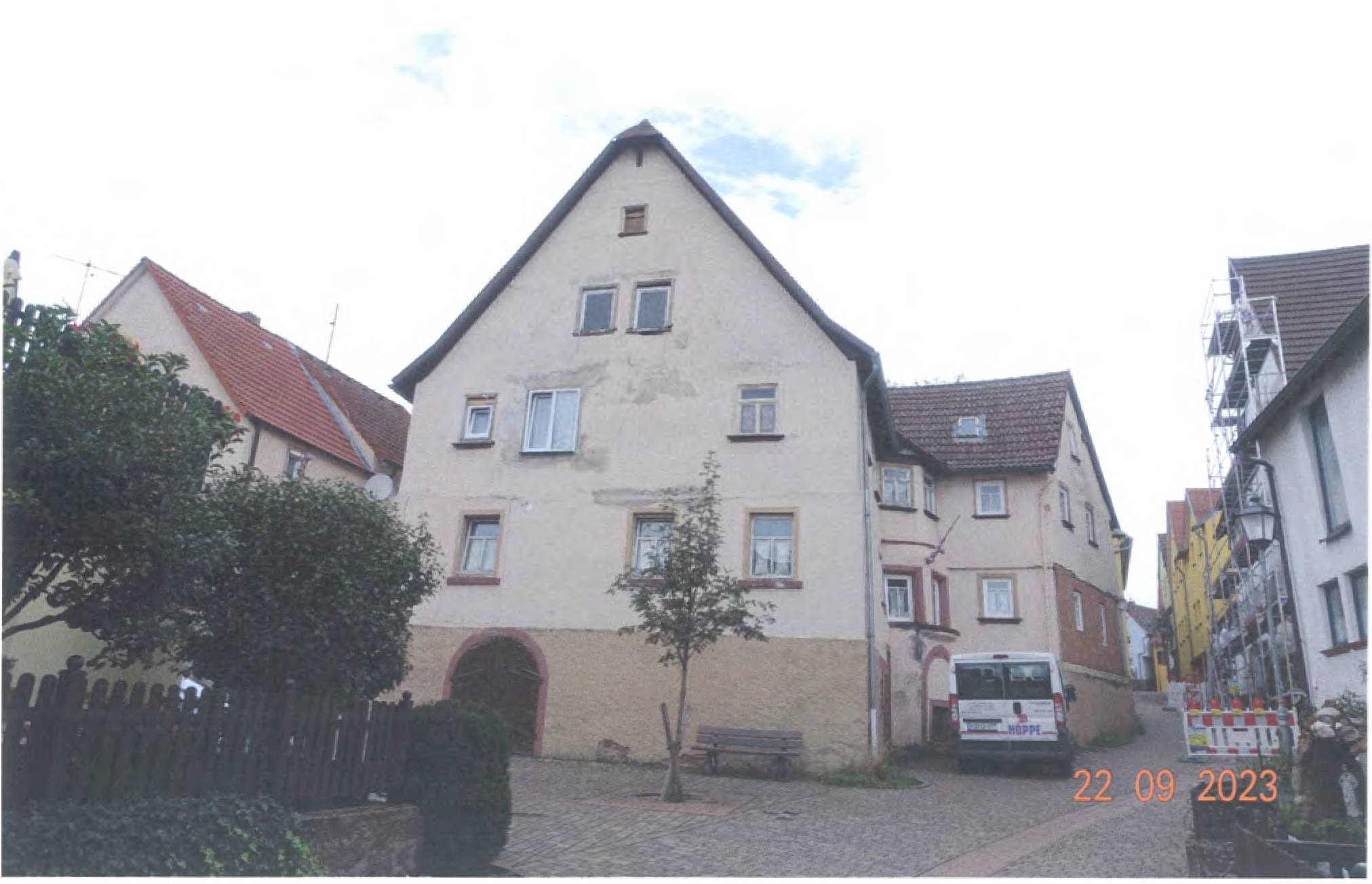 Unregelmäßig vieleckiges Grundstück bebaut mit zweigeschossigem Zweiflügelbau mit Treppenturm; verputztes Fachwerkobergeschoss mit Schopfwalm- bzw. Satteldach; Erdgeschoss mit profiliertem Rundbogenportal und Inschriftstein;