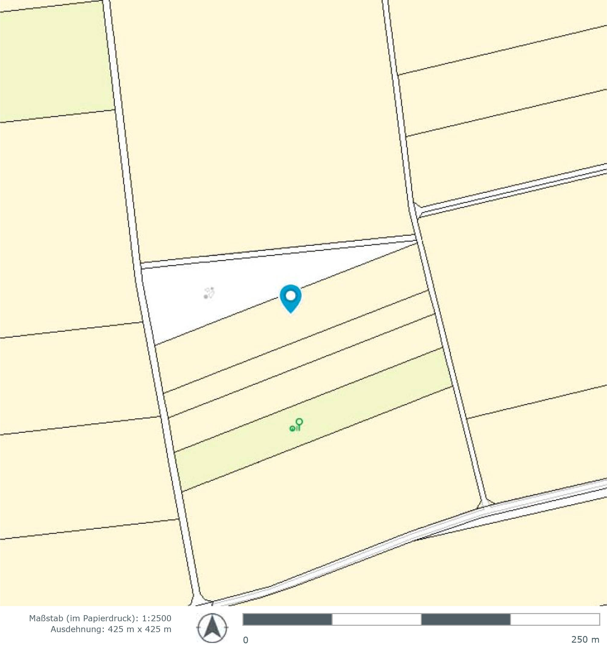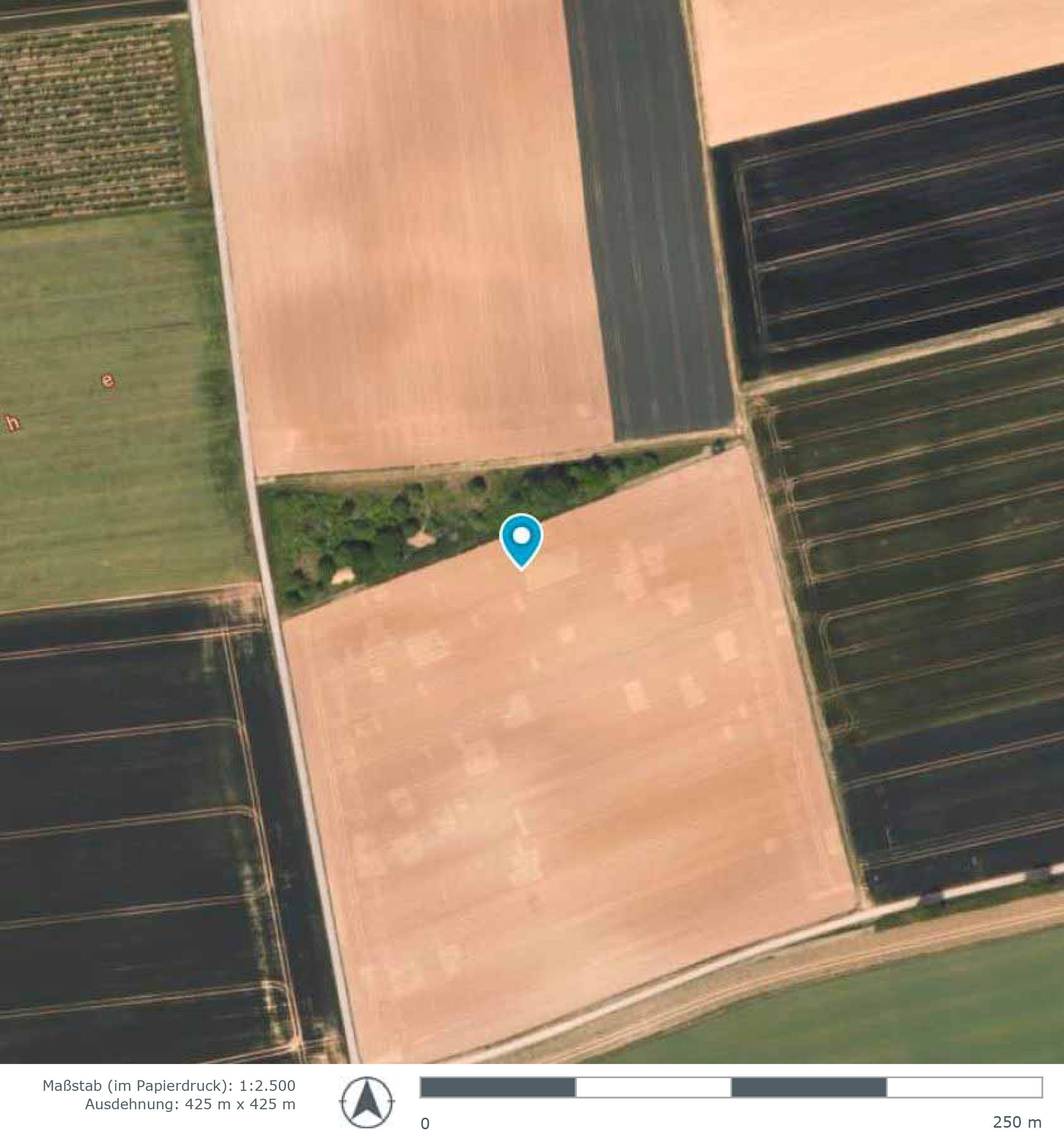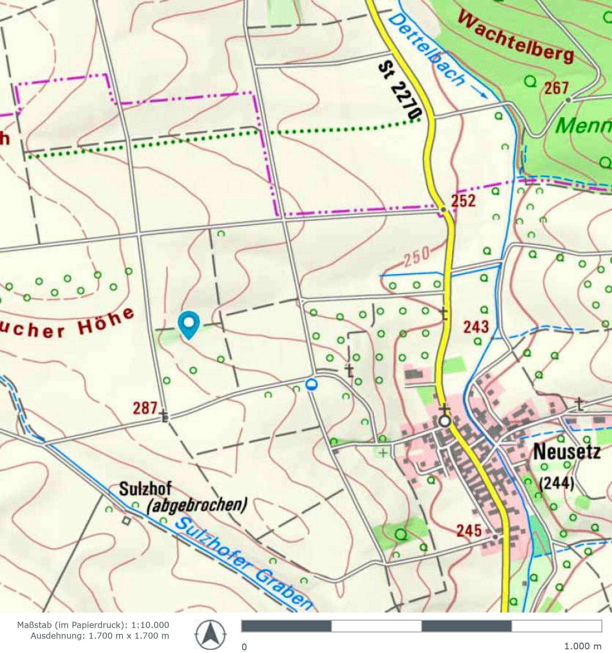 Trapezförmiges Grundstück (Landwirtschaftsfläche) ca. 1,5 km nordwestlich vom Ortskern Neusetz, ansteigend von Ost nach West. Zugang zum Grundstück im Westen über asphaltierten Wirtschaftsweg, im Osten über unbefestigten Wirtschaftsweg.