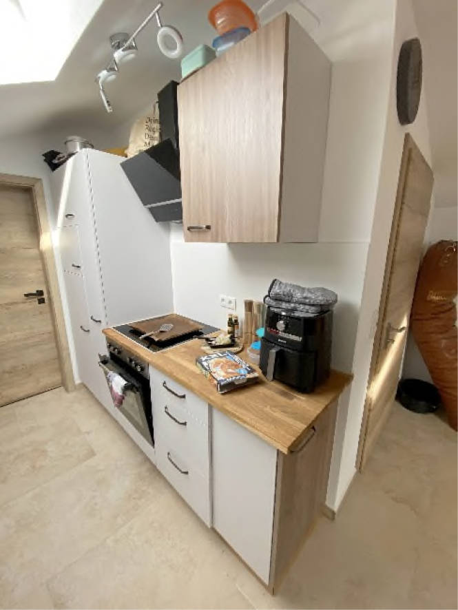 Zubehör Einbauküchenzeile (4 lfm) im Personalaufenthaltsraum Büro EG bestehend aus Unterschränken, 2 Hochschränken, Oberschränken, Einbauspüle, Spülmaschine, Elektroherd, Cerankochfeld, Herdabluft, Kühl-/Gefrierschrank, Einbauküche in Wohnung DG bestehend aus Unterschränken, 2 Hochschränken und 1 Oberschrank, Korpus, Fronten- und Arbeitsplatte kunststoffbeschichtet, Einbauspüle, Spülmaschine, Elektroherd, Cerankochfeld und Ablufthaube