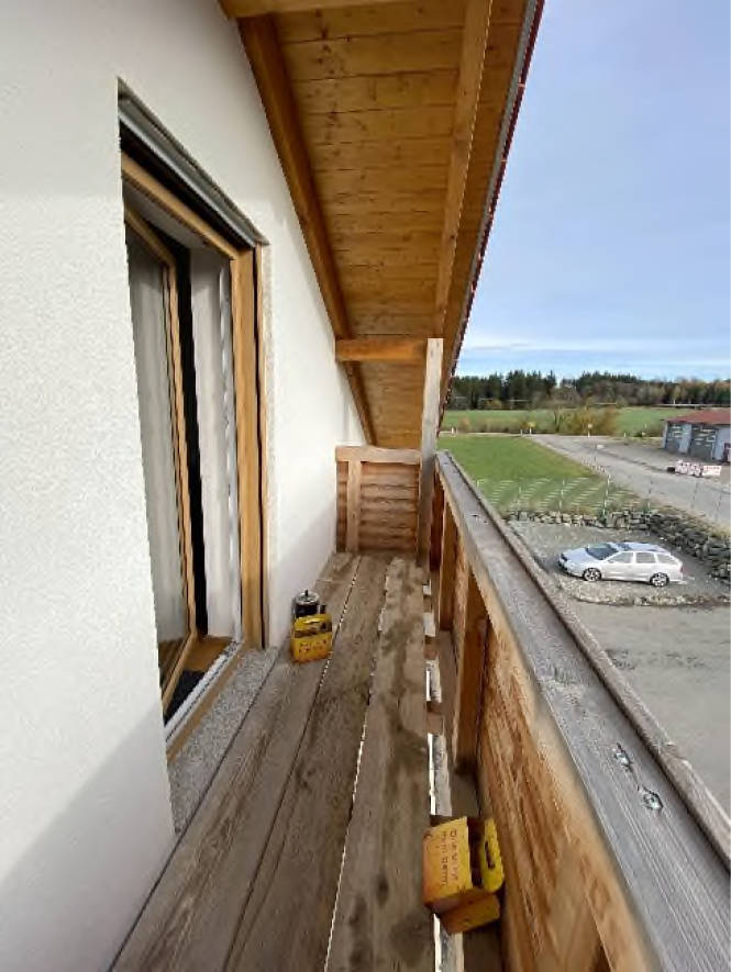 Besondere Bauteile überdeckter Eingangsbereich Büro mit Betonsteinpflaster, Balkone im OG und DG auf Südseite aus Holzkonstruktion