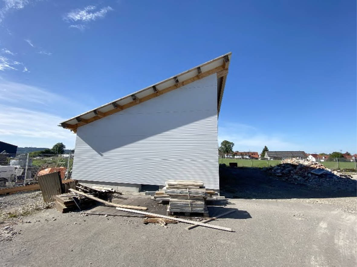 Außenwände 3-seitig Betonsockel, Wände aus Holzriegelwerk mit Blechsandwichverkleidung 40 mm, Ostwand offen mit 2 Betonstützen