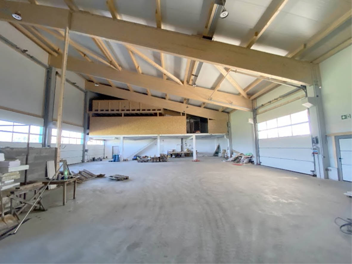 Bodenbeläge Betonboden mit maschinell geglätteter Oberfläche in der Lagerhalle und beim 1. Lagerboden, OSB-Plattenbelag im 2. Lagerboden