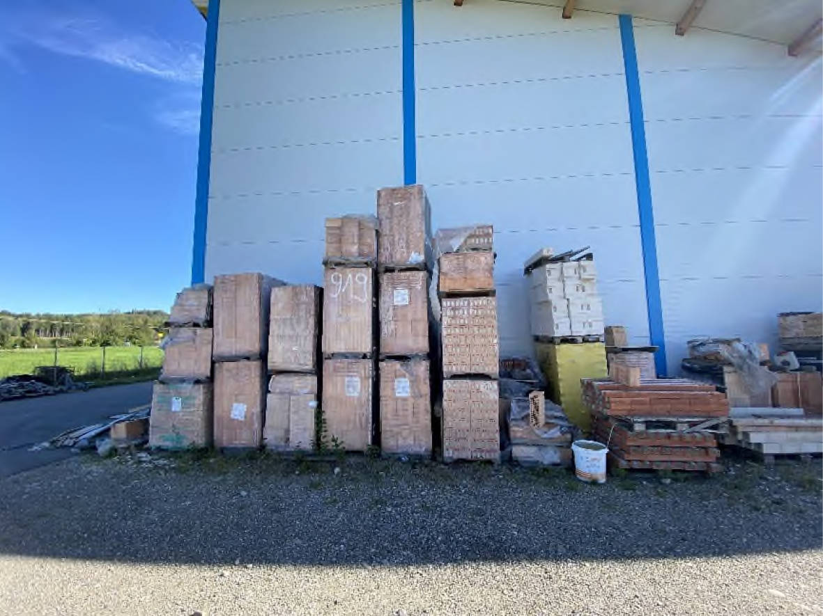 Hofeinfahrt und Hofflächen südlich, östlich und westlich des Büro- und Lagergebäudes asphaltiert (Tragdeckschicht, ca. 1.500 m²), Park- und Lagerflächen entlang der Südgrenze und westlich des Bürogebäudes mit Rasengittersteinen (ca. 280 m²) befestigt, Weg nördlich Lagerhalle gekiest und planiert, gekieste Freilagerflächen entlang der Ostgrenze 3,6 m tief (ca. 220 m²), entlang der Westgrenze ca. 3 m bis 6 m tief (ca. 250 m²) und nördlich der Lagerhalle (ca. 450 m²), Aufkiesung aus Wandkies oder Abbruchrecyclingmaterial, Zufahrt und Fläche nördlich und westlich der Überdachung gekiest, Grünflächen aus Rasen entlang der Südgrenze, Böschung entlang Südgrenze und der südlichen Grünfläche mit Trockenmauer aus Naturbruchsteinen, Grünfläche (ca. 140 m²) an der nordöstlichen Grundstücksecke mit Versickerungsgrube, Grünfläche uneben und mit Wildwuchs und Pferdemistablagerungen, Grundstückseinfriedung aus verzinktem Maschengitterzaun 2 m hoch, entlang Westgrenze tlw. mit Stützmauer aus Betonschalungssteinen, Hofeinfahrt mit 10 m breitem Aluschiebetor mit Elektroantrieb, Grünfläche entlang Nordgrenze (ca. 90 m²) nördlich der Zauneinfriedung aus Wiese. Die Außenanlagen wurden um 2021 hergestellt. Die Asphaltierungen und die Flächen mit Rasengittersteinen befinden sich in einem normalen Pflege- und Unterhaltungszustand. Auf dem Grundstück befinden sich Ablagerungen des Vorbesitzers.