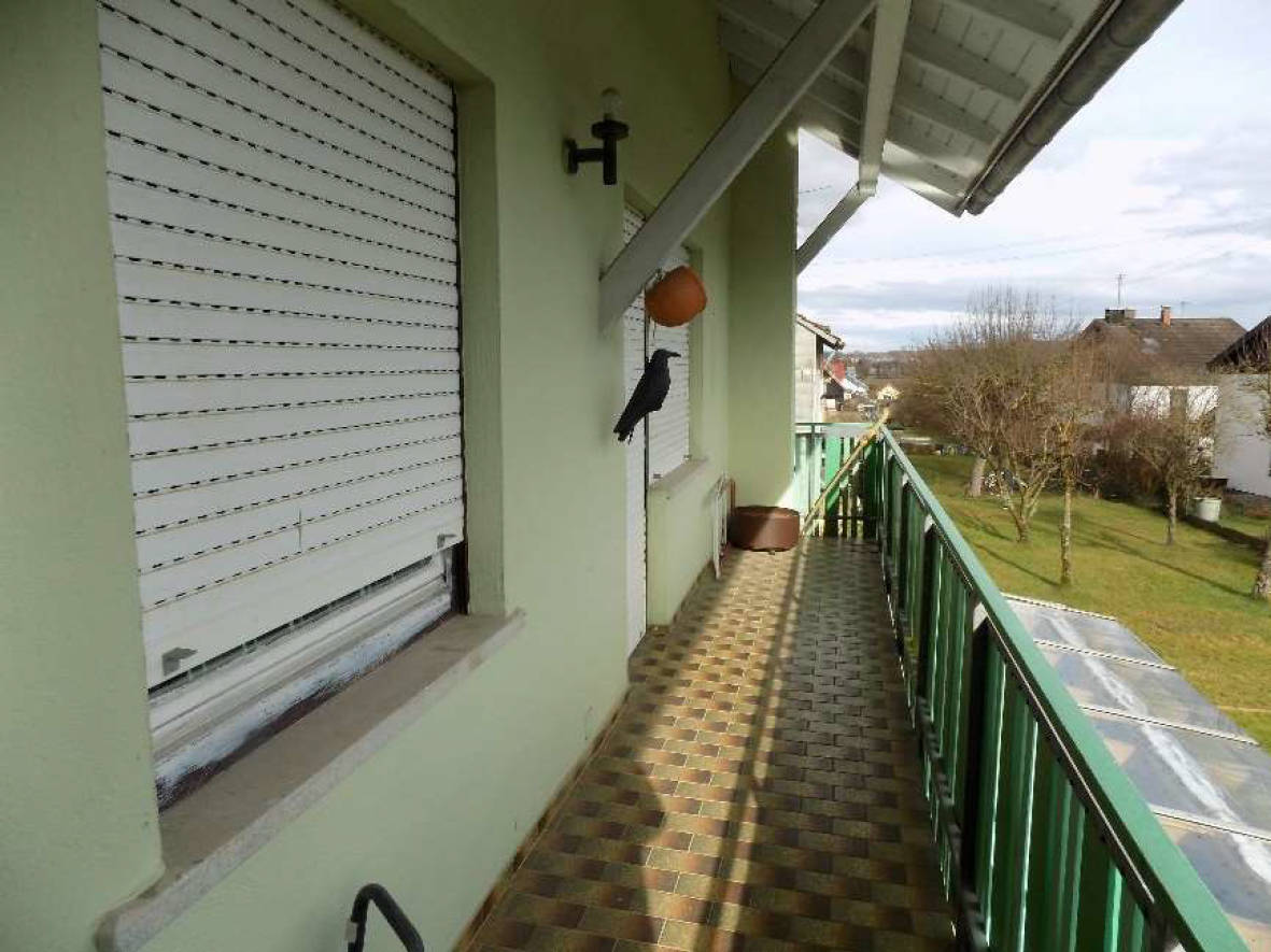 Balkon Betonplatte mit Fliesenbelag, Holzbrettgeländer auf Stahlkonstruktion