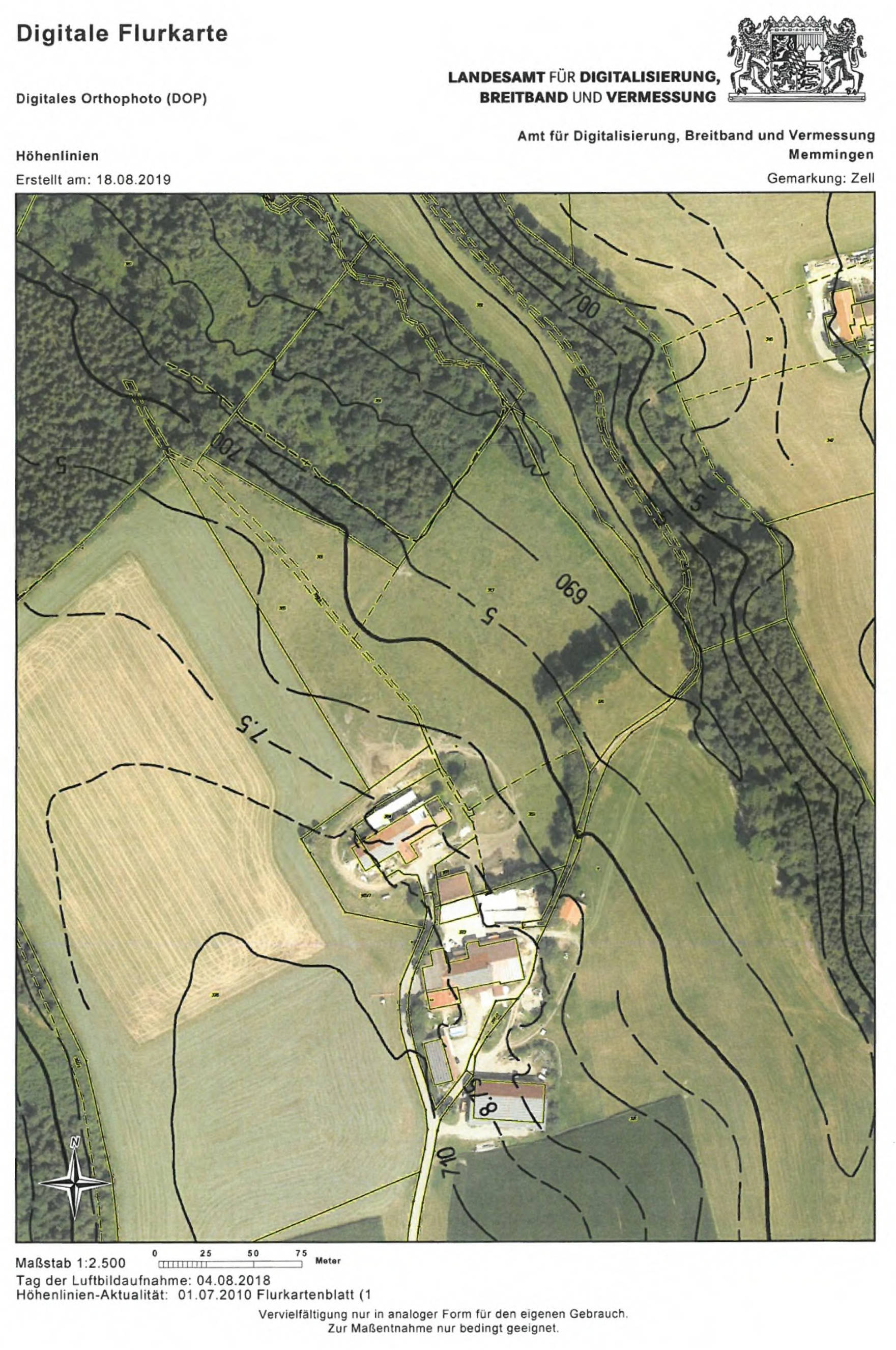 Zuschnitt Breite ca. 120 bis 130 m, Tiefe ca. 145 m, im östlichen Bereich wird Grundstück durch Bachlauf (FlNr. 361/2) durchschnitten (mit 2 verrohrten Überfahrten)
