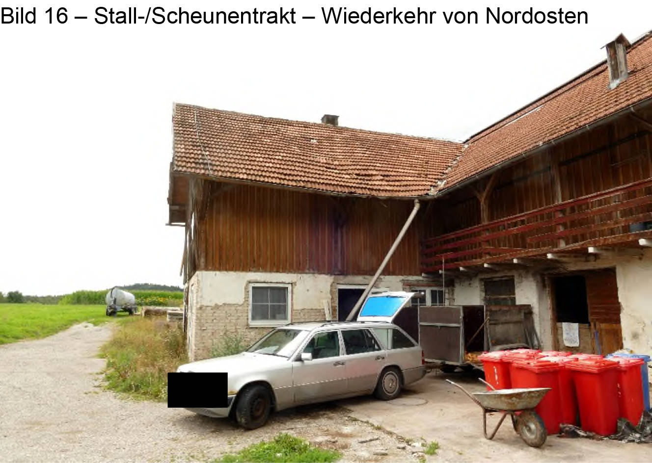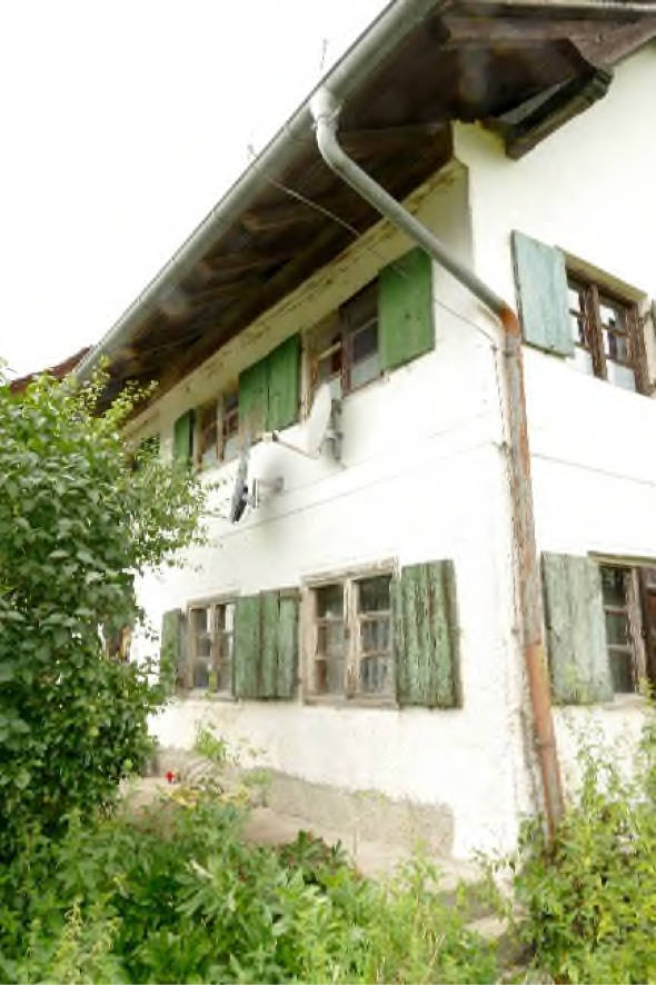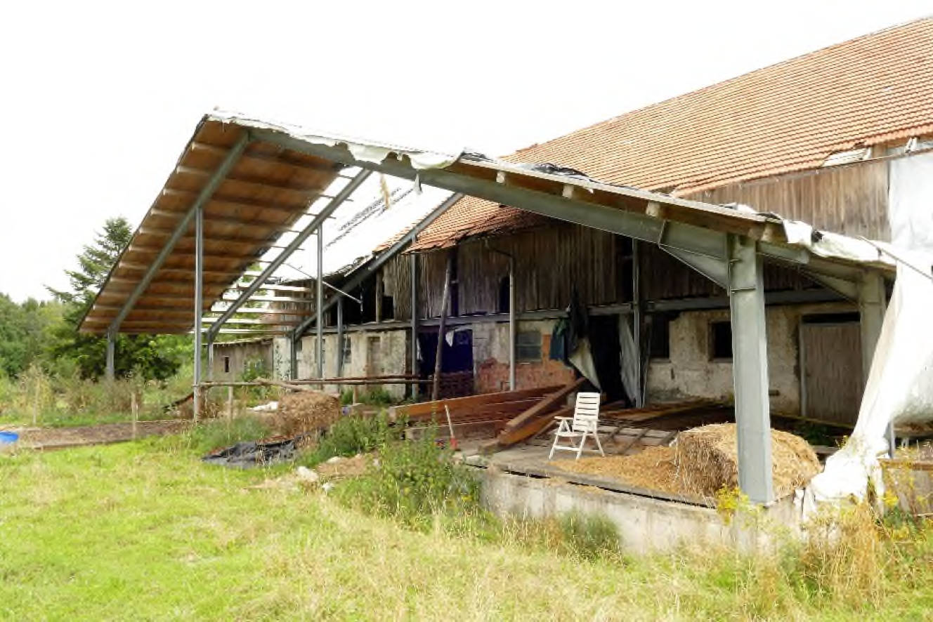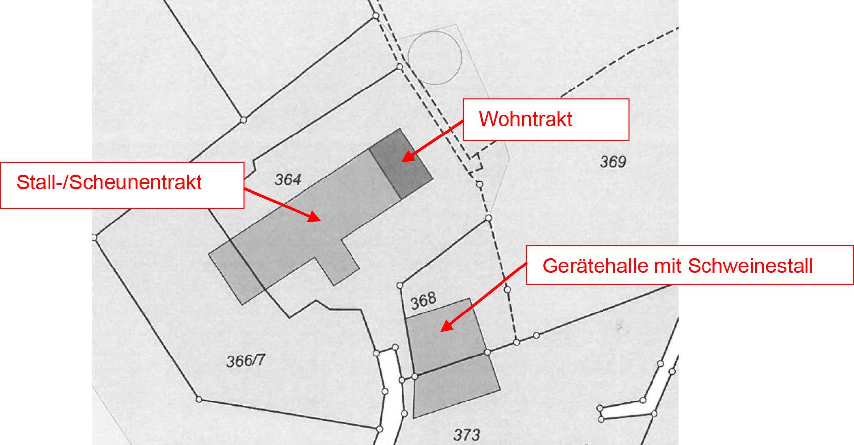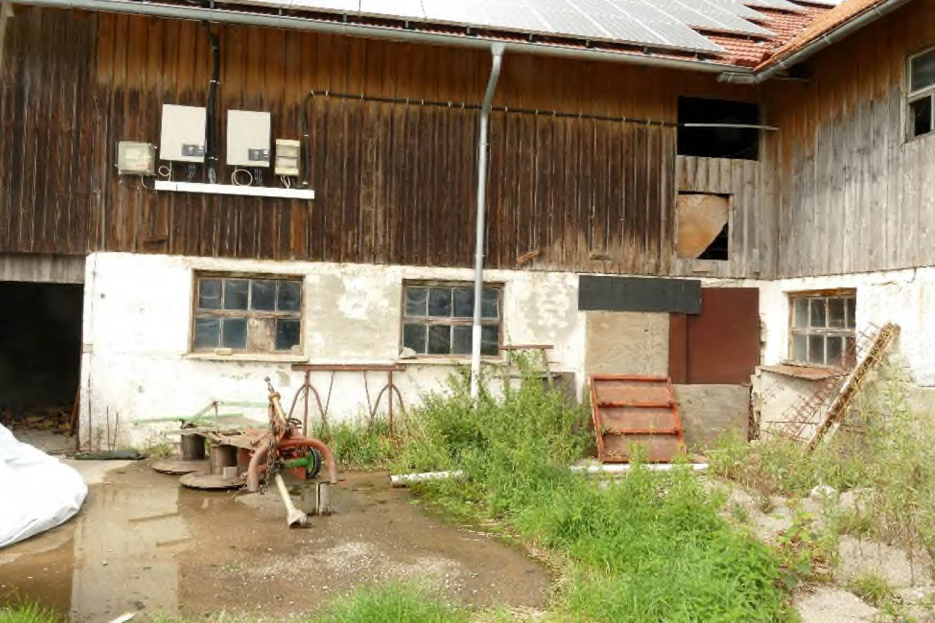 Allgemeines Eine Besichtigung der Gebäude und der Grundstücke war, wie bereits unter Pkt. 1.7 beschrieben, nicht möglich. (...) Auf den Grundstücken FlNr. 364 und 366/7 befindet sich ein Bauernhaus und auf dem Grundstück FlNr. 368 eine Gerätehalle mit Schweinestall. Das Bauernhaus besteht aus einem Wohntrakt und dem Stall-/Scheunentrakt. Der Wohntrakt besteht aus einer Teilunterkellerung, Erdgeschoss, Obergeschoss und nicht ausgebautem Dachgeschoss. Im Norden ist an das Wohnhaus ein erdgeschossiger Holzlagerschuppen angebaut.