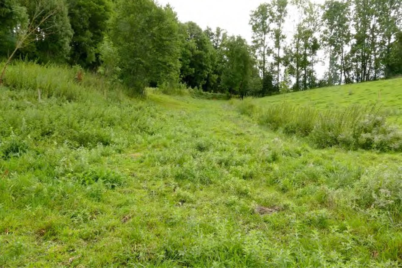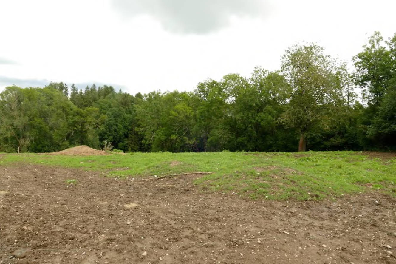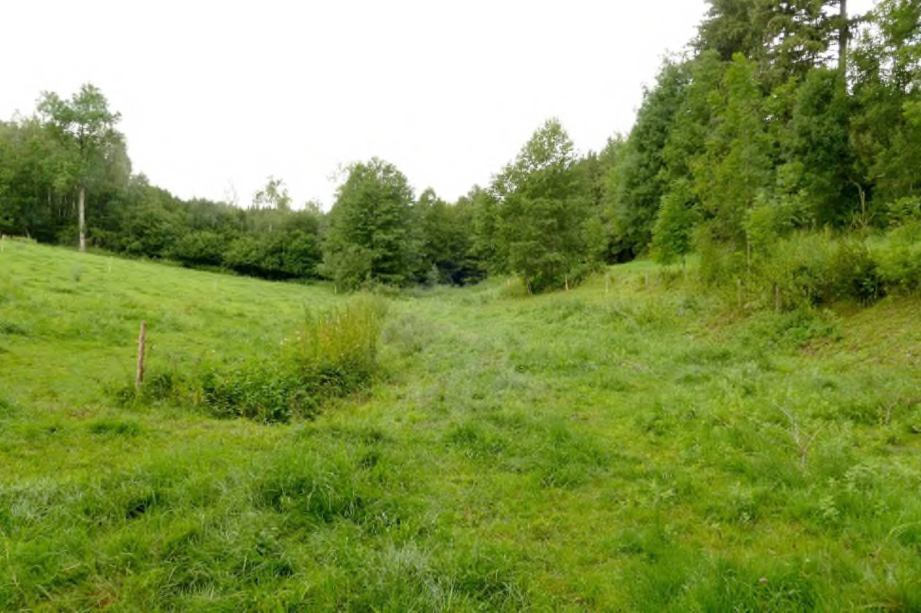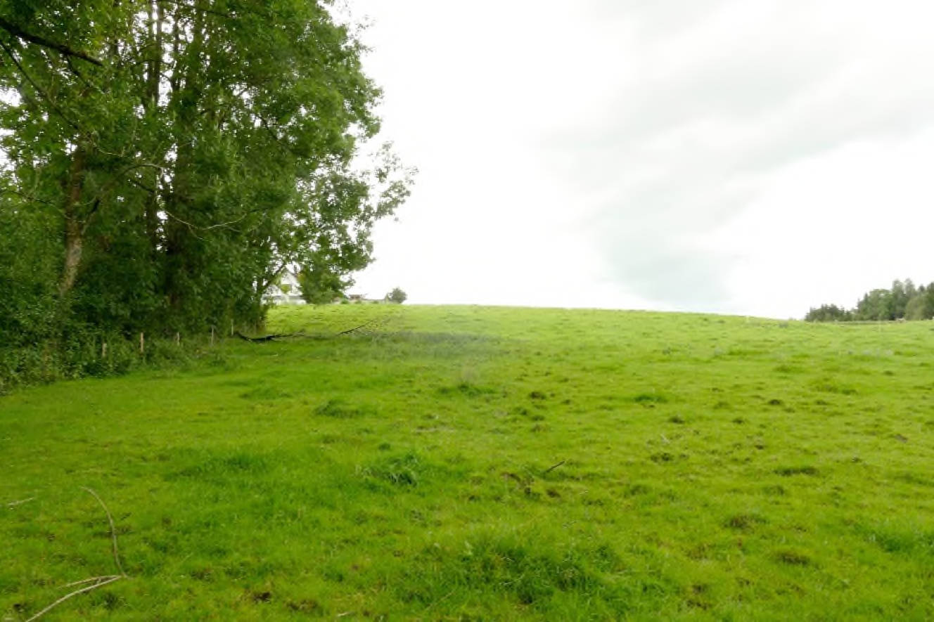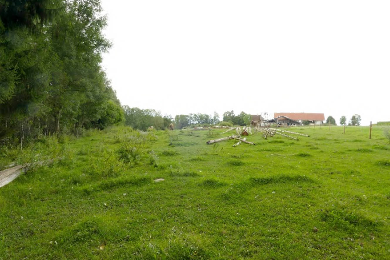 Beschaffenheit Grünland mit einfacher bis mittlerer Ertragsfähigkeit, im südöstlichen Bereich Fläche mit Staunässe (ca. 2.500 m²), Fläche östlich Bachlauf mit starken Unebenheiten und Wildwuchs, Laubwald im Nordosten (ca. 400 m²) ohne Bestandeswert, stehendes Gewässer im Nordosten (Tümpel, ca. 178 m²) mit umlaufendem Schilffbewuchs, biotopkartiertes Feldgehölz entlang der Südostgrenze