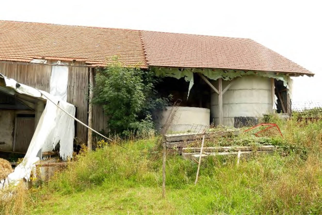 Bebauung offener Güllerundbehälter aus Stahlbeton, Durchmesser 12 m, Tiefe 4 m, 1,30 m über Gelände überstehend, 2- Kammerklärgrube und 3-Kammerklärgrube für Abwässer Wohnhaus mit Überlauf in Güllegrube
