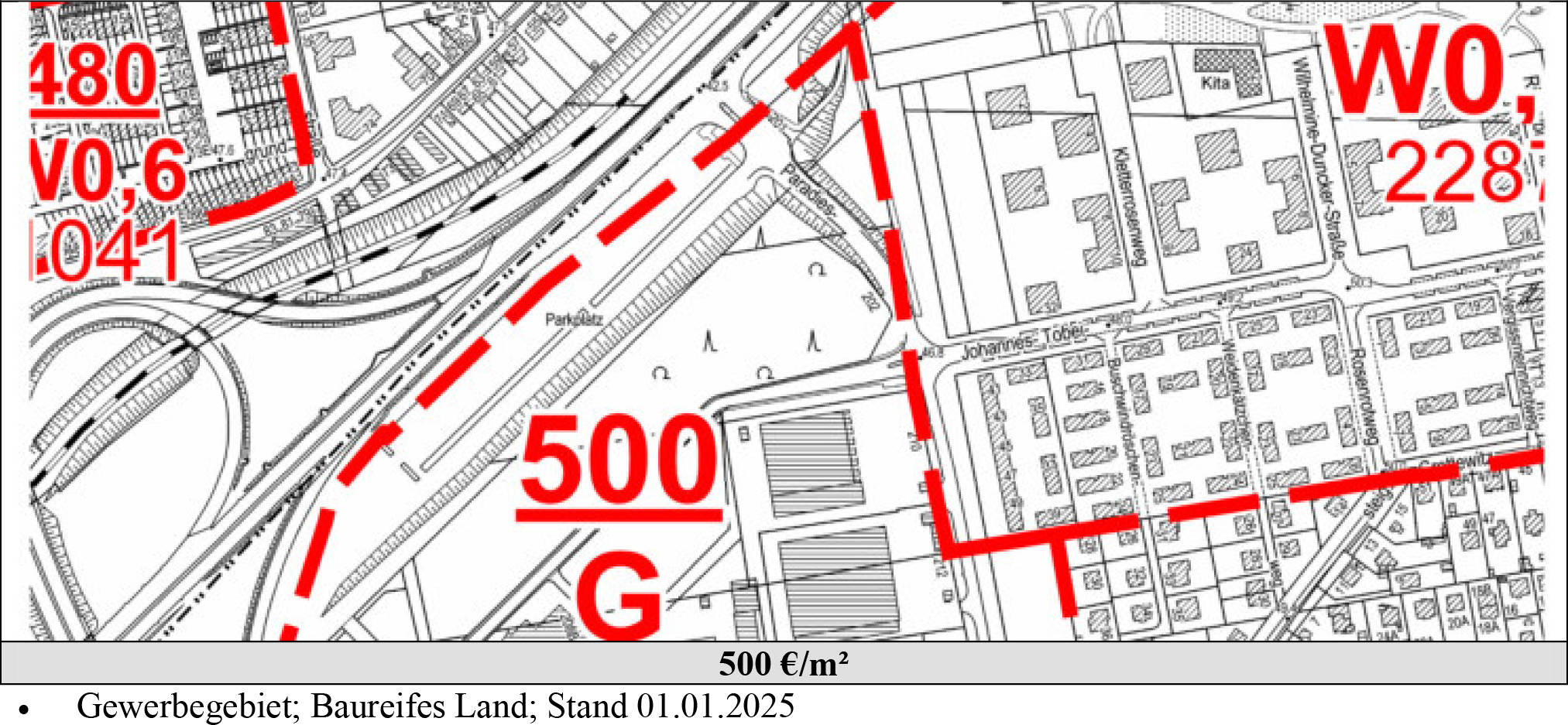 2. Das insgesamt 5.574 m² große Grundstück befindet sich im Außenbereich, an der Grenze zum Innenbereich. Es wurde als Bauerwartungsland bewertet. Die 2017 erteilte Baugenehmigung für ein Parkhaus ist erloschen. Das Grundstück ist mittels mobilen Bauzaun eingefriedet. Der Wert dieses Zubehörs (Bauzaun) wurde auf 2.550,00 EUR festgesetzt.