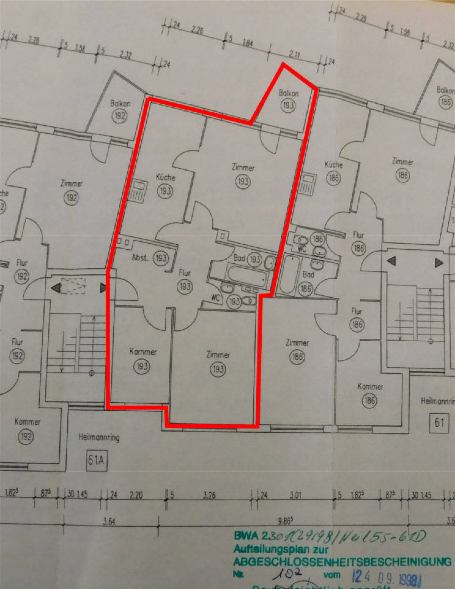 7 Tage kostenlos TestenEigentumswohnung Nr. 193 nebst Keller. Die Wohnung liegt im Aufgang Heilmannring 61 A, 2. Obergeschoss rechts eines viergeschossigen Mehrfamilienhauses, ist vermietet und verfügt über 3 Zimmer, Balkon, Küche, Bad und gesondertes WC, Flur, Abstellbereich. Die Wohnung ist vermietet. Ein Sondernutzungsrecht ist nicht zugeordnet.