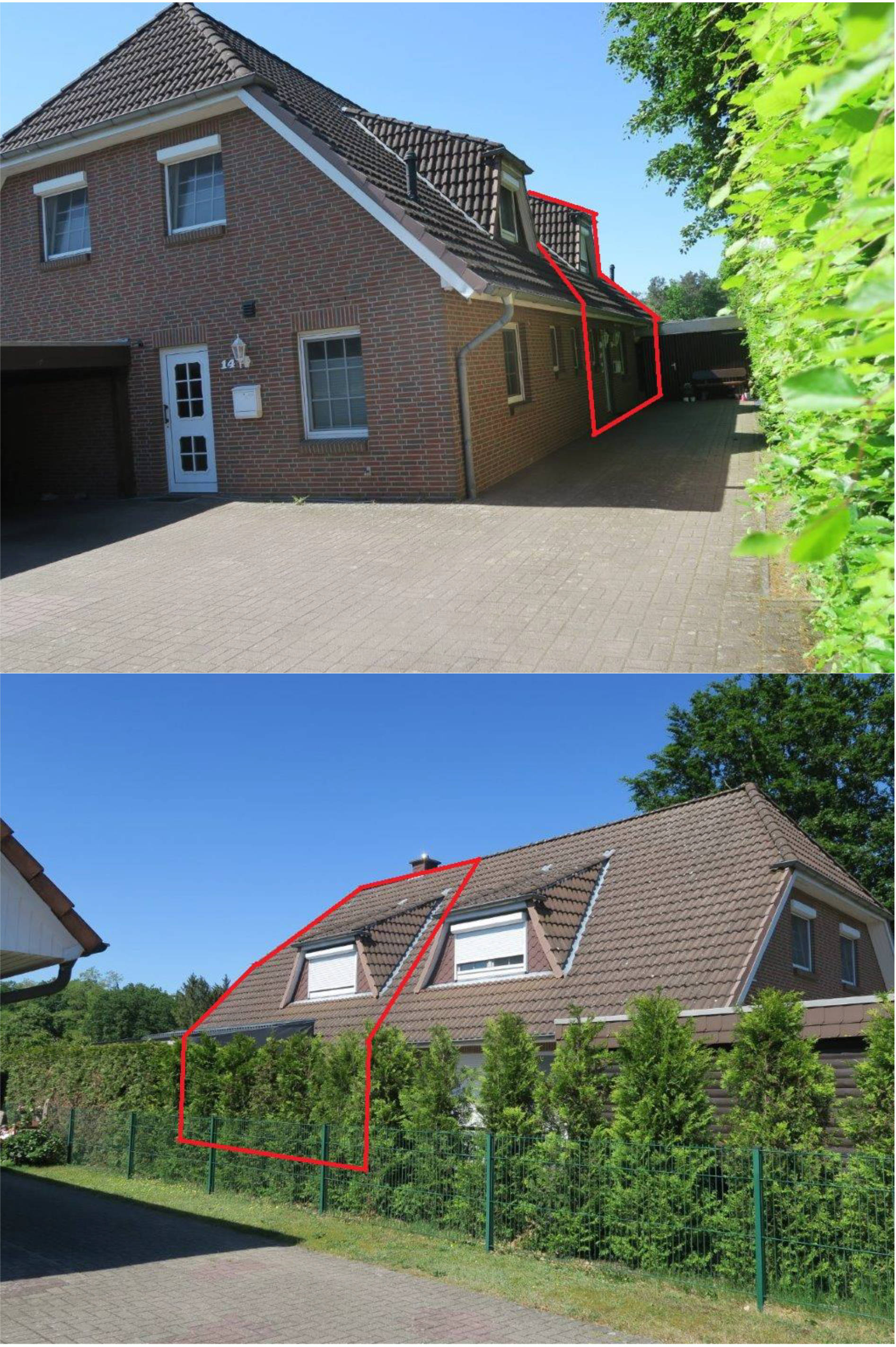 7 Tage kostenlos Testen1 1/2 geschossige Doppelhaushälfte, Baujahr 1995/96 Wohnfläche ca. 114 m², 4 Zimmer, Küche, Bad, Terrasse. Garage in Holzbauweise, Baujahr 1996, Erweiterung 2019 Nutzfläche ca. 58 m². Auf den Bildern ist das Objekt rot umrandet.