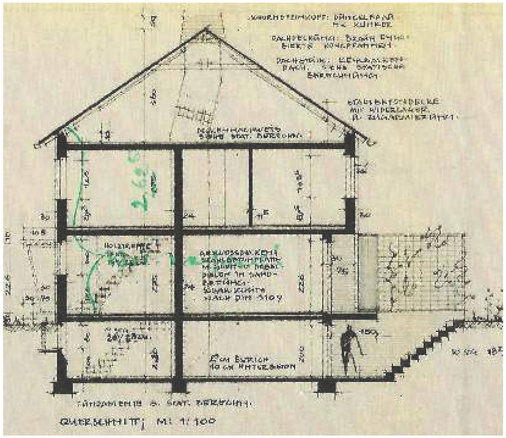 Das Reihenmittelhaus wurde 1960 in Massivbauweise errichtet und ist voll unterkellert. Es verfügt über Erdgeschoss, Obergeschoss sowie einen ausgebauten Dachboden, der über eine Ausziehtreppe erreichbar ist. Das Gebäude bietet einen baujahrestypischen, schmalen und langgestreckten Grundriss mit 3 Haupträumen sowie 2 Dachbodenräumen, Flur, Küche und zwei Bädern. Die Wohnfläche beträgt ca. 85 m², die Nutzfläche im Keller etwa 31 m². Die Grundrissgestaltung ist funktional mit einer guten Belichtung und Querlüftung, wenngleich das Bad im OG kein Fenster besitzt und die Räume im Dachgeschoss überwiegend als Abstell- oder Zusatzräume nutzbar sind. Die lichte Raumhöhe liegt im KG bei ca. 1,95 m, in den Wohnbereichen bei ca. 2,40–2,50 m.