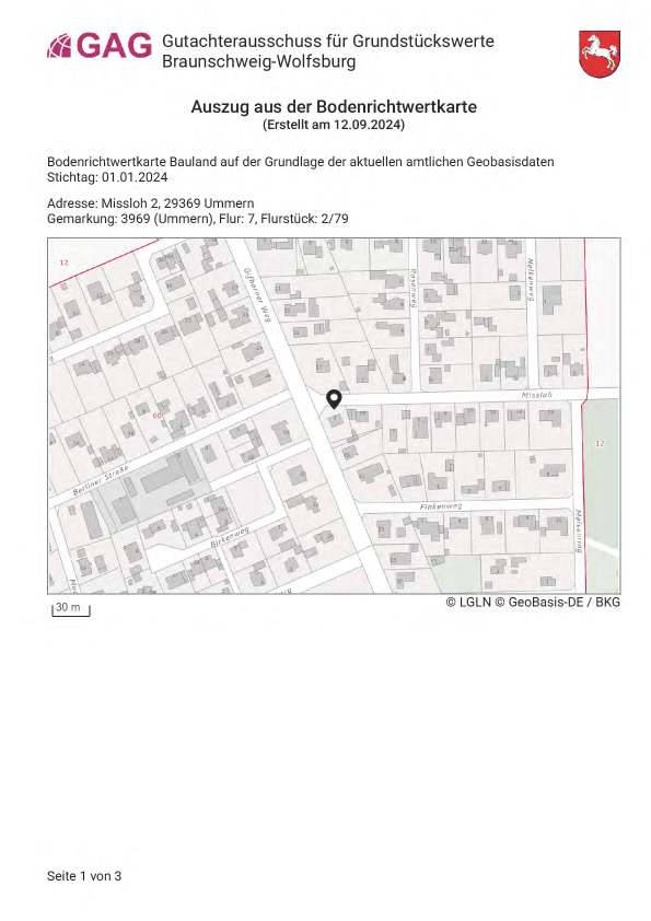 Das Grundstück liegt in der Flur 7, Flurstück 2/79 und ist laut Bodenrichtwertkarte als baureifes Land (Wohnbaufläche) ausgewiesen. Es ist annähernd rechteckig zugeschnitten und liegt auf der östlichen Seite einer Anliegerstraße. Die Grundstücksfläche ist dem Dokument nicht direkt zu entnehmen. Der Bewuchs besteht teils aus Bäumen und Sträuchern, in Teilbereichen ungepflegt. Die Topografie ist vermutlich eben, keine speziellen Hinweise auf Hanglagen.