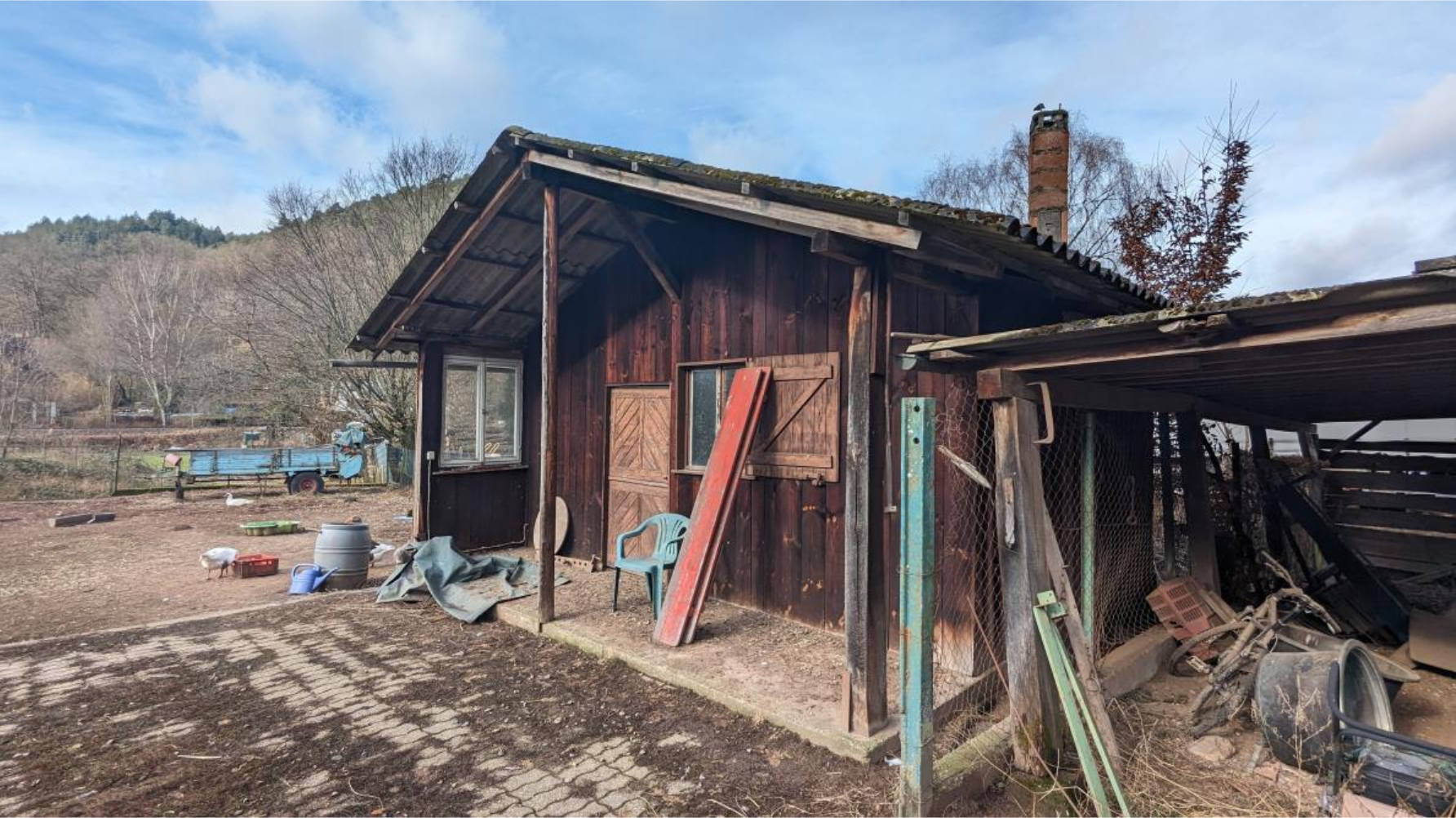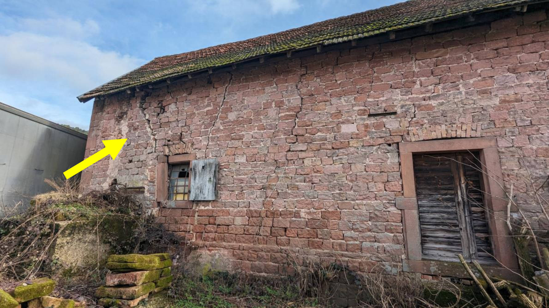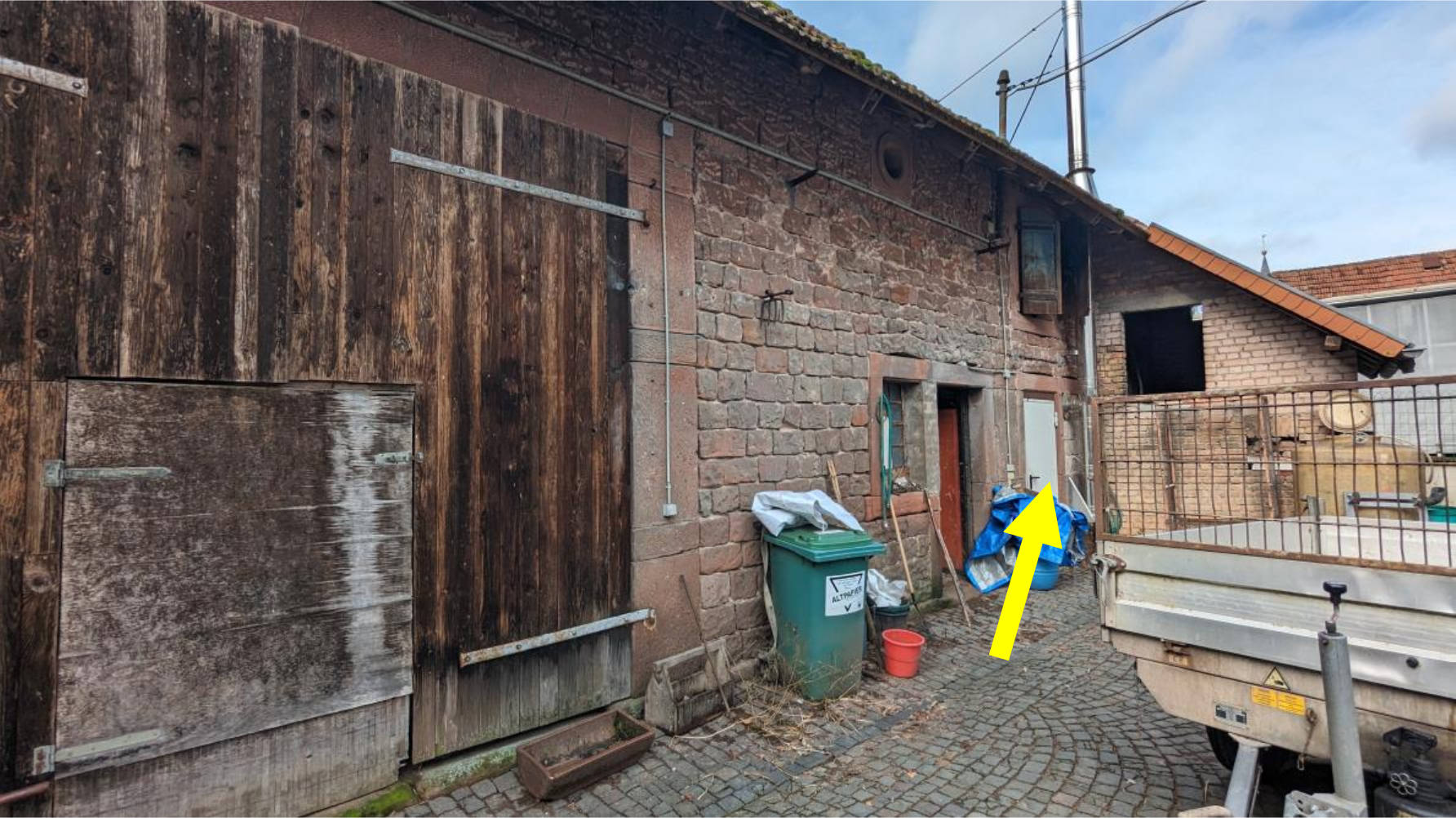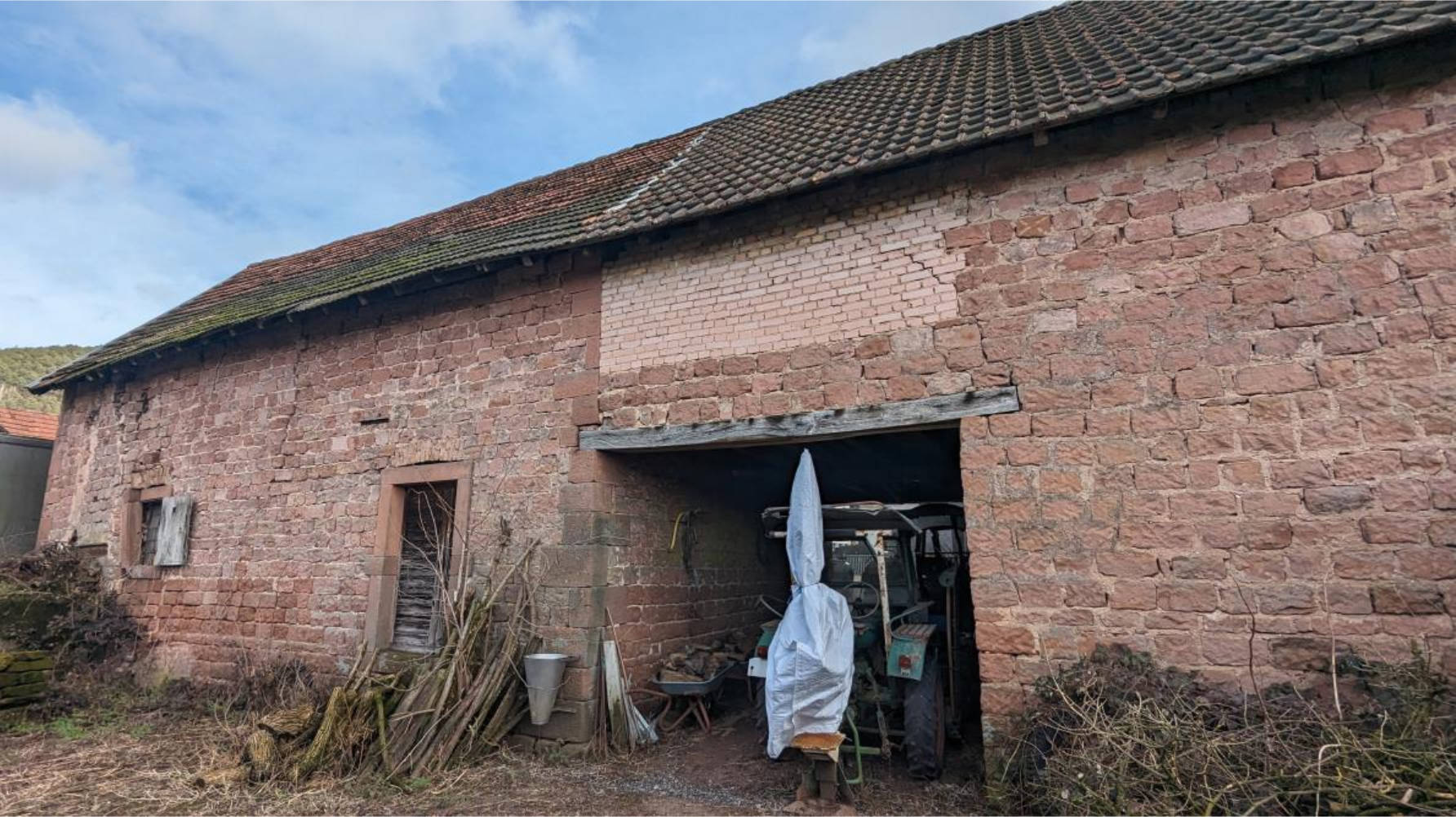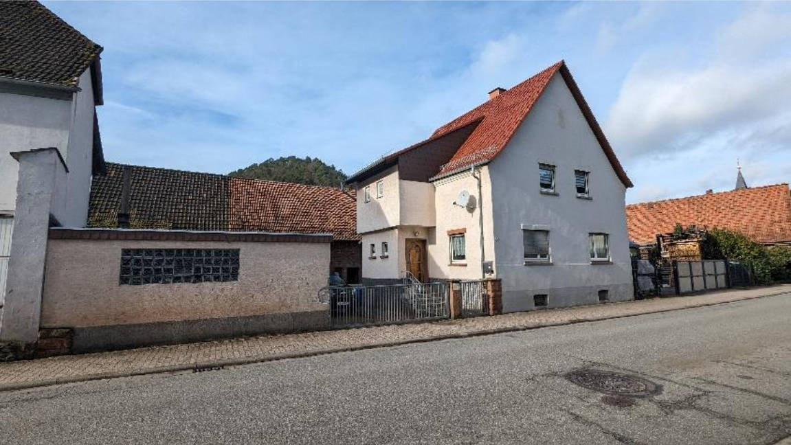 Grundstück mit stark unregelmäßiger Form, bebaut mit ca. 1920 errichtetem und ca. 1947 wiederaufgebautem zweigeschossigem, unterkellertem Ein- bis Zweifamilienhaus (Nutzung als Zweifamilienhaus setzt Umbaumaßnahmen voraus) mit überwiegend ausgebautem Satteldach, weiter: einsturzgefährdete Sandsteinscheune, Holznebengebäude für Tierhaltung (ohne Wert) sowie massive Doppelgarage. Mehrseitige Grenzbebauung. Die Grundstückseinzäunung im hinteren Bereich entspricht nicht dem tatsächlichen Grenzverlauf. Die 2012 erneuerte Heizung (Holzheizung mit Pufferspeicher) liegt außerhalb des Wohngebäudes in der Scheune. Für Teilabbruch der Scheune und Bedachung des Heizraumes ca. 42.500,00 € Kostenaufwand.