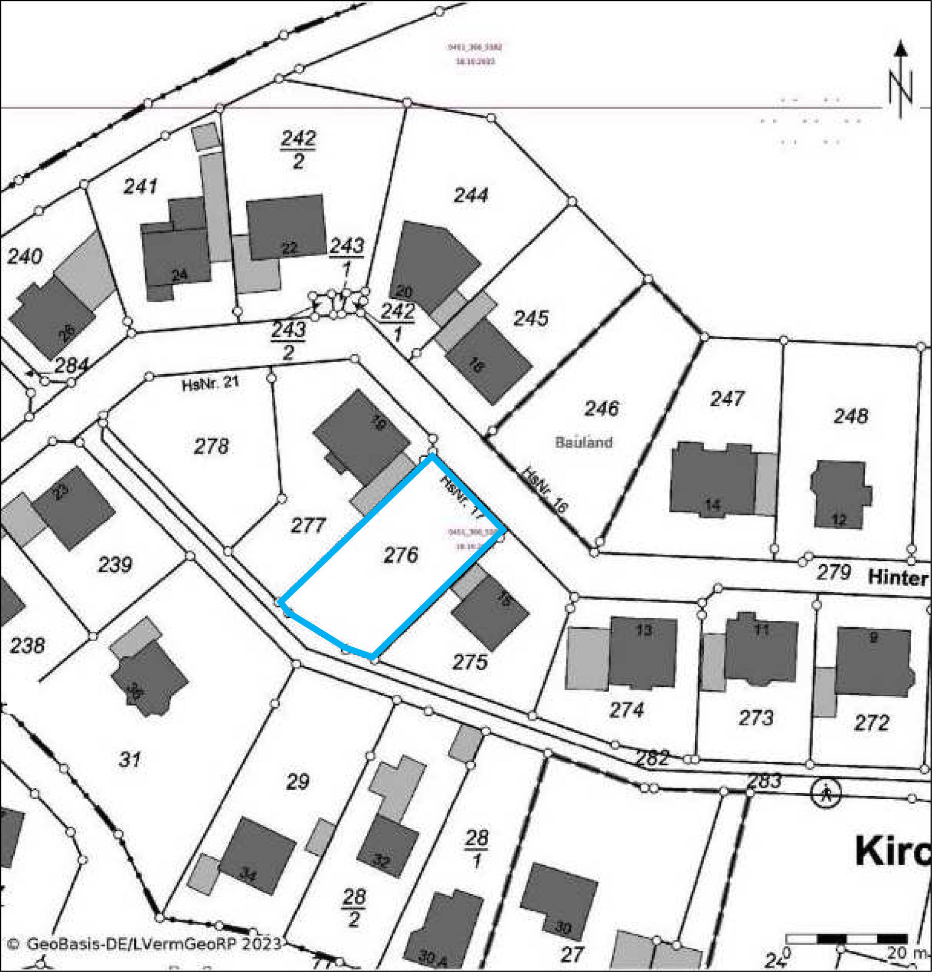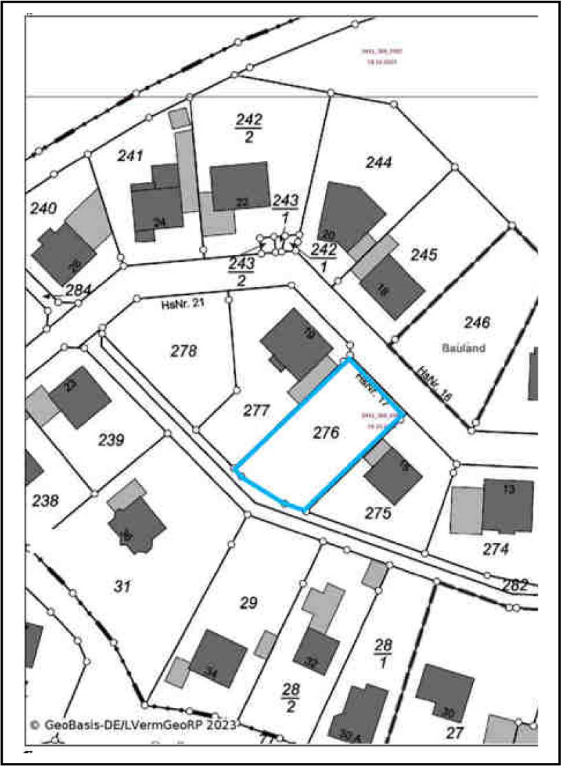 Es handelt sich laut Gutachten um ein unbebautes Grundstück (als Bauland bewertet und als Bauplatz genutzt) unter der Objektadresse „Hinter Pöschen 17“ in Ortsrandlage von 56729 Kirchwald. Es gilt ein entsprechender Bebauungsplan.Zur weiteren detaillierten Objektbeschreibung (insbes. Bauplanungsrecht, Bauordnungsrecht, öffentliche Lasten, Altlasten) wird auf den Gesamtinhalt des Gutachtens verwiesen.