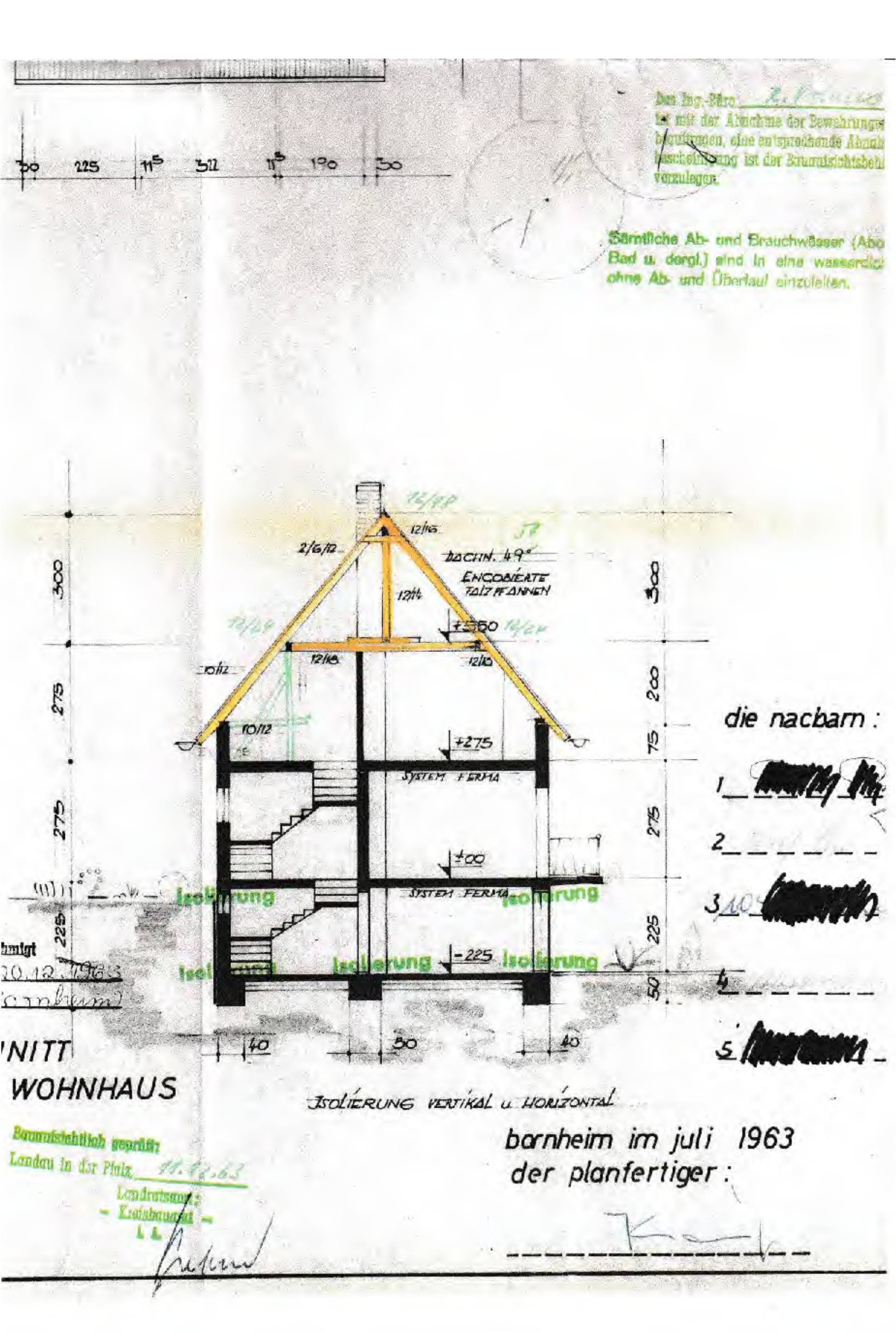 - Einfamilienhaus: Eingeschossig, unterkellert, ausgebautes Dachgeschoss, freistehend, mit Anbau, Baujahr 1693, Anbau 1982. Die Wohnfläche beträgt rd. 89,21 m²; die Bruttogrundfläche (BGF) beträgt rd. 244,67 m².