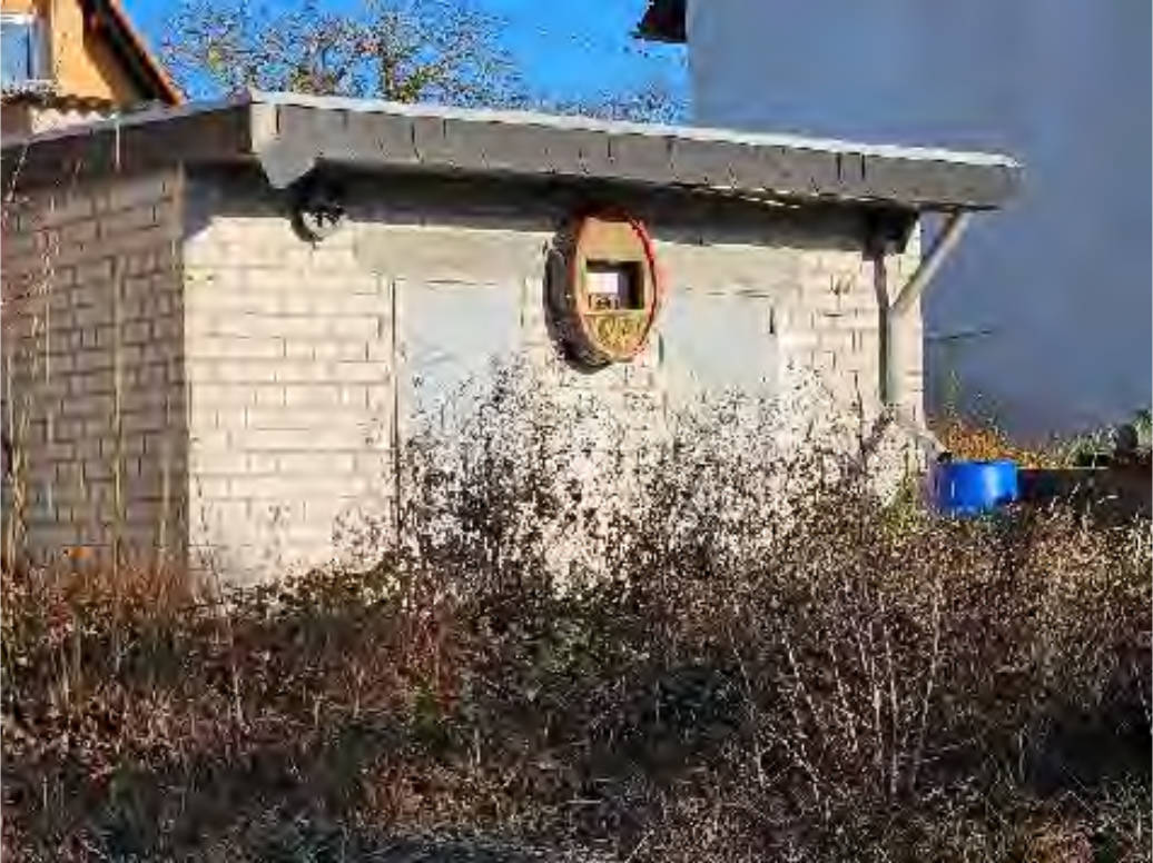 - Garage (massiv, Schwingtor), Pultdach mit Welleternitdeckung; Gerätegebäude massiv, Pultdach mit Welleternitdeckung.