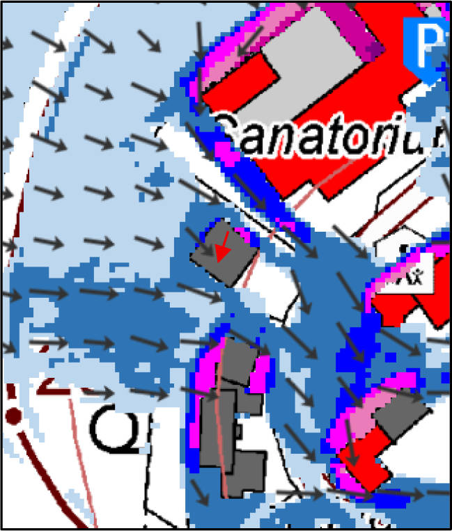 Art der Bebauung und Nutzungen in der Straße und im Ortsteil: Im Umfeld des Bewertungsgrundstücks befinden sich gastgewerbliche sowie wohnbauliche Nutzungen; überwiegend aufgelockerte, zweigeschossige Bauweise; im Nordwesten grenzt das Bewertungsgrundstück an unbebaute Baugrundstücke ; Hinweise: Unmittelbar angrenzend befindet sich ein Haus der Deutschen Venen-Akademie, das jedoch seit dem 1. Januar 2022 ungenutzt ist. In der unmittelbaren Nachbarschaft ist ebenso ein Kindergarten vorhanden.