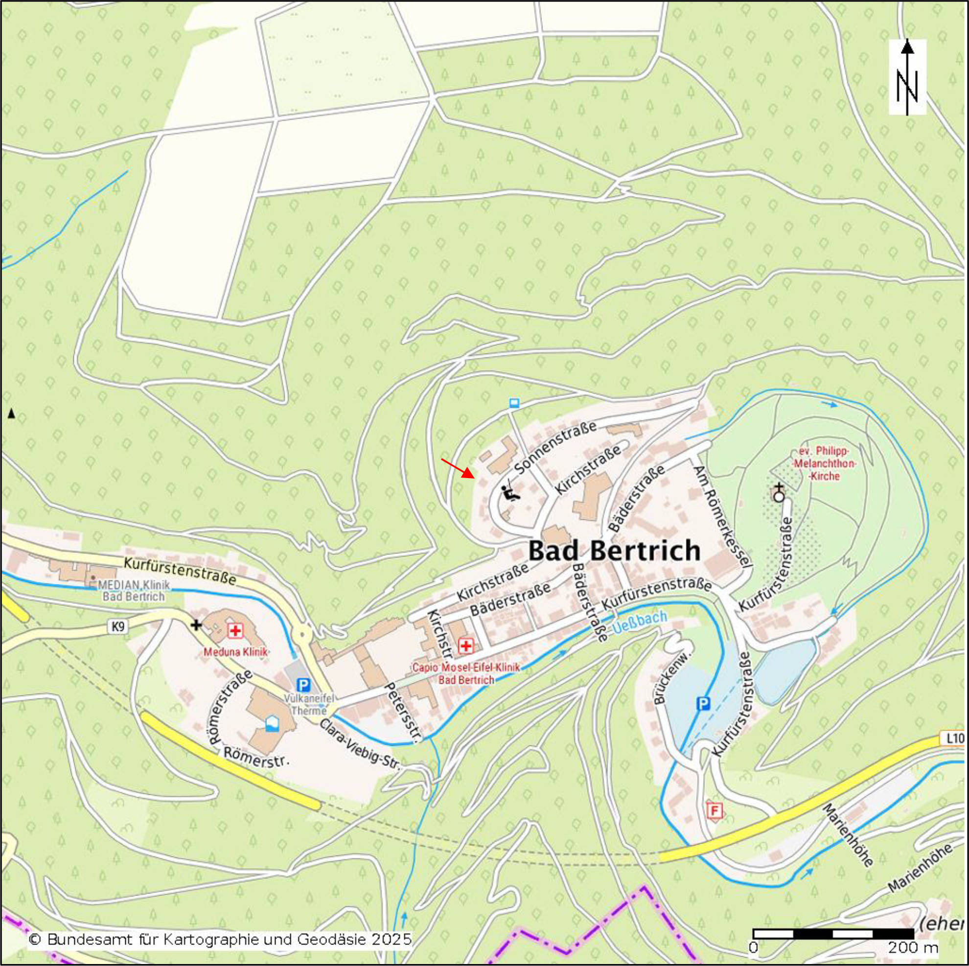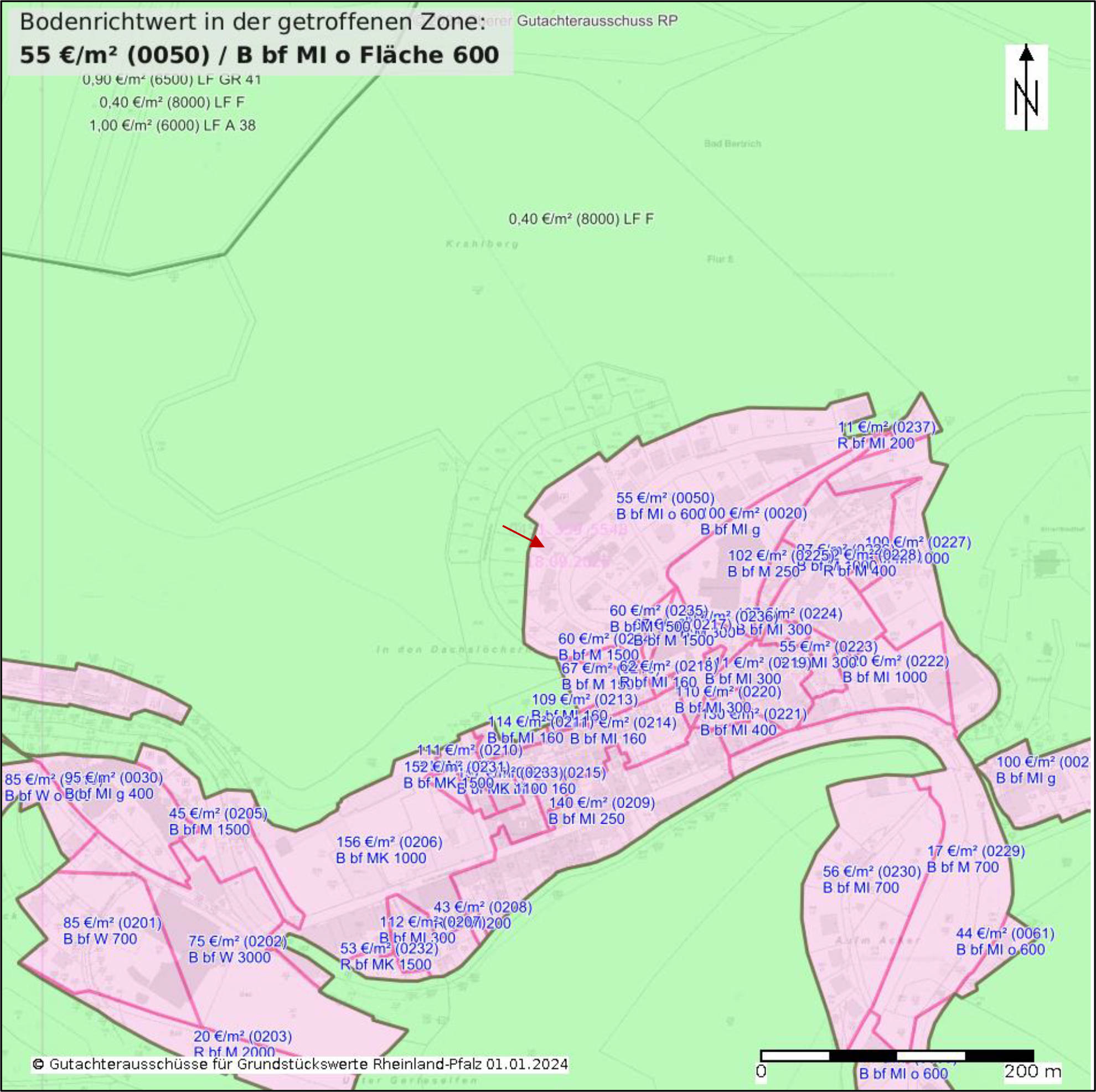 innerörtliche Lage: Das Bewertungsobjekt liegt am nördlichen Rand von Bad Bertrich an der Sonnenstraße in einer Höhenlage, die eine gute Aussicht nach Südosten ermöglicht. Geschäfte des täglichen Bedarfs sind in Lutzerath und Zell vorhanden. Weiterführende Schulen gibt es in Lutzerath oder Ulmen (Realschule Plus) sowie in Zell (Integrierte Gesamtschule). Die Verbandsgemeindeverwaltung befindet sich in Ulmen. Öffentliche Verkehrs-mittel (Bushaltestellen) sind in fußläufiger Entfernung vorhanden (Haltestellen „Schwanenteich" und „Kurzentrum", jeweils 650 m entfernt).