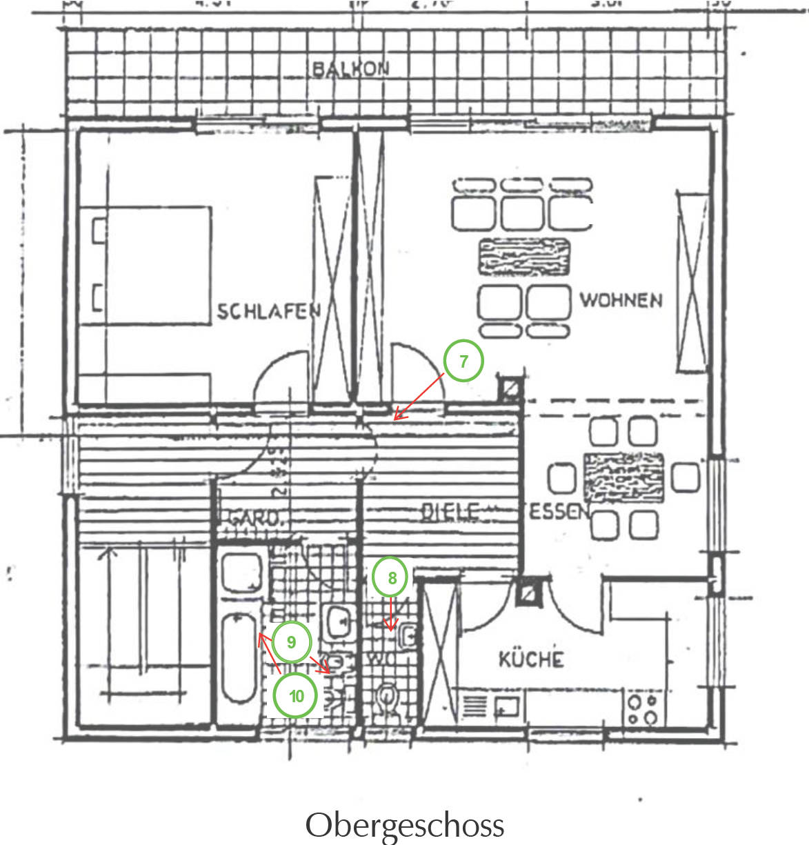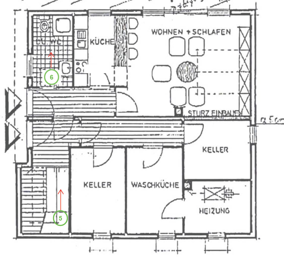 Heizung: Zentralheizung, Gaskessel aus den 1980er Jahren; zusätzlicher Kaminanschluss für einen Ofen im Wohnzimmer im OG; tlw. Stahlradiatoren und tlw. Flachheizkörper mit Thermostatventilen
