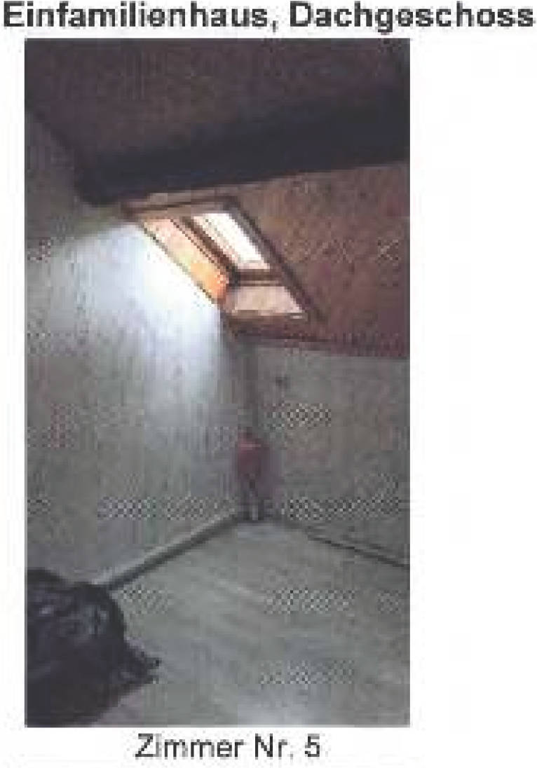Dachgeschoss: Einfamilienhaus (mit Anbau): Flur mit Treppenhaus, Wohnzimmer, Zimmer Nr. 5, Badezimmer, Küche.