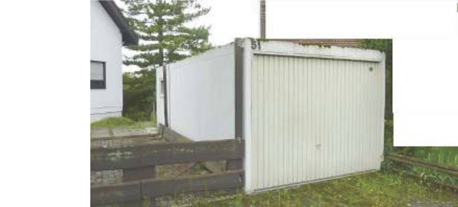 Zur Liegenschaft gehört eine Garage, Baujahr ca. 1982/83, als Stahlbeton-Fertiggarage mit Flachdach und Stahlschwingtor. Die Garage weist Abnutzungserscheinungen und die für Flachdächer typische Reparaturanfälligkeit auf. Zusätzlich bestehen befestigte PKW-Stellplätze im Freien vor und neben der Garage.