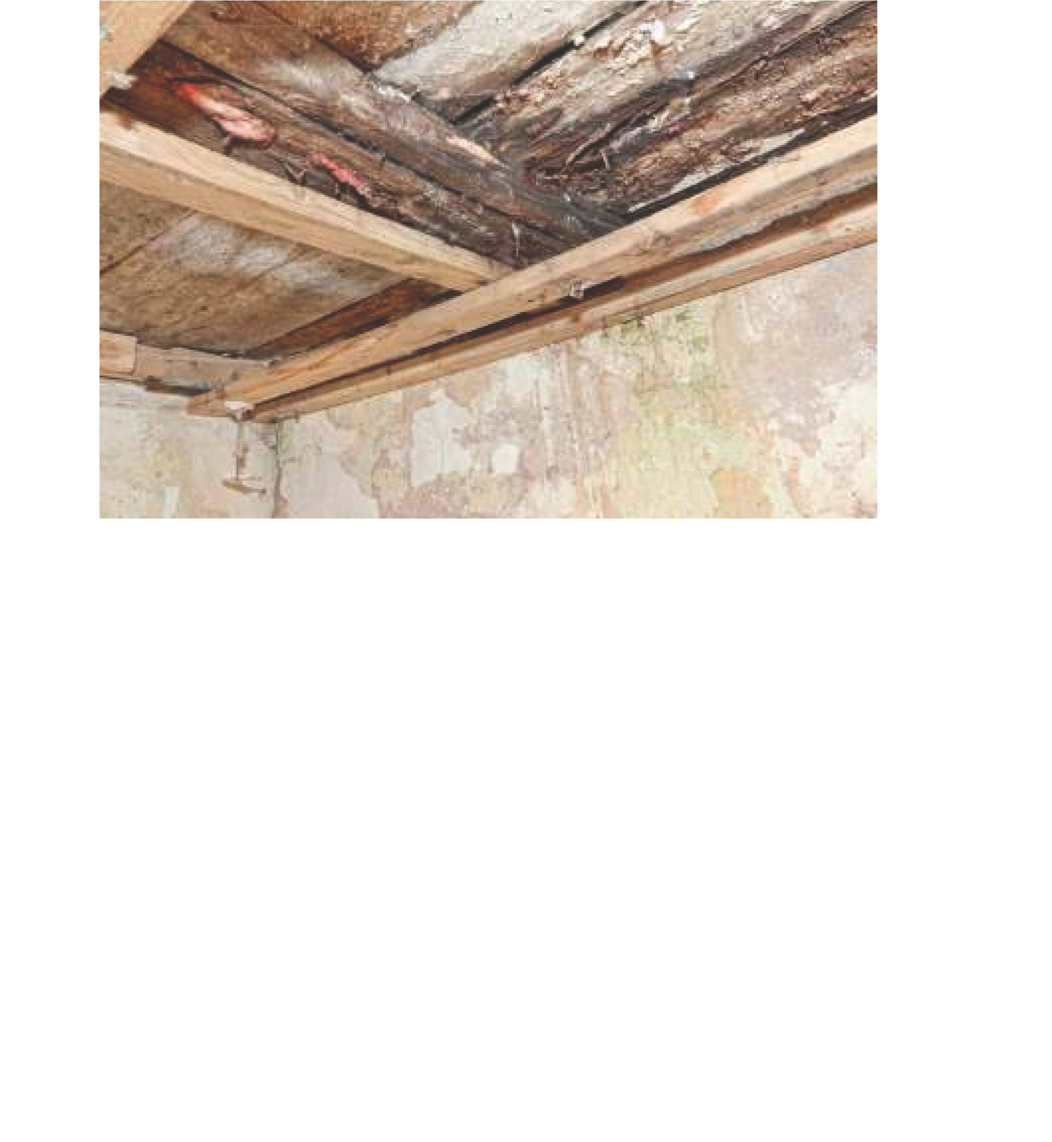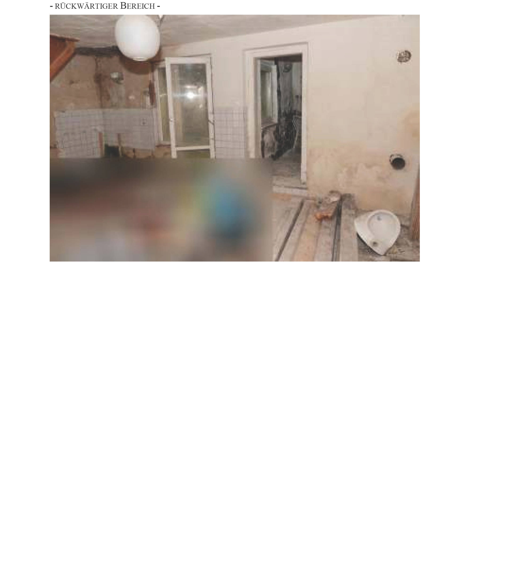 Erhebliche Baumängel und Bauschäden liegen vor: feucht-schadhafter Keller (Schimmel, Putzschäden, schadhafte Stahlträger), undichtes und unvollständiges Dachgeschoss, bereits festgestellter Schädlingsbefall in der Holzbalkendecke, beschädigte oder fehlende Fenster und Türen, starke Schäden an Wand-, Boden- und Deckenflächen, fehlende Sanitärausstattung, keine Heizung oder Warmwasseraufbereitung sowie eine wirtschaftlich überalterte Elektroinstallation. Die begonnene Modernisierung blieb im Rohbauzustand zurück und ist teilweise laienhaft ausgeführt – die Ausführung entspricht nicht den anerkannten Regeln der Baukunst.