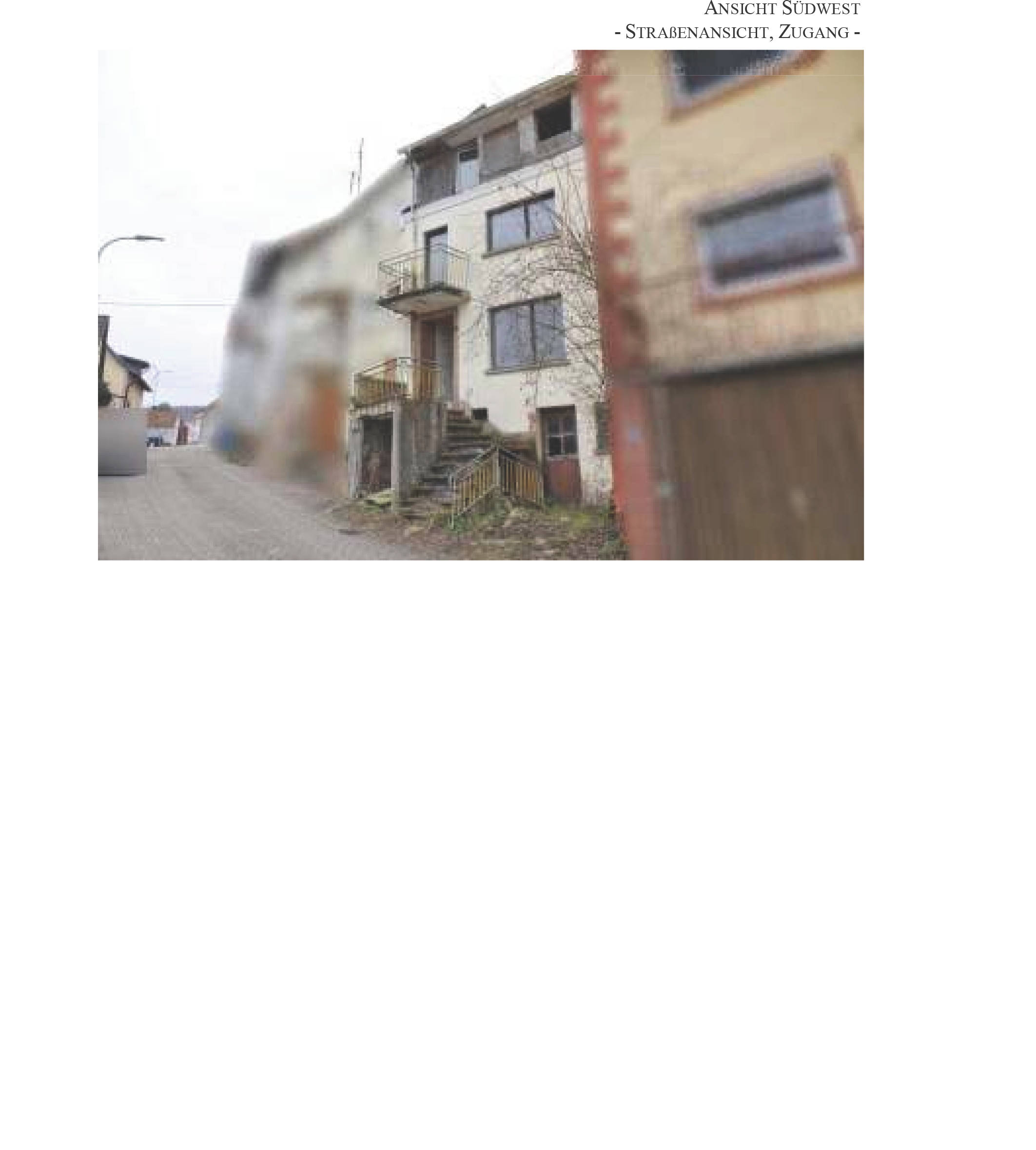 Das Objekt besteht aus einem 2-geschossigen Einfamilienhaus in Reihe mit beidseitiger Grenzbebauung. Das Gebäude ist unterkellert und das Dachgeschoss ist ausgebaut. Das massive Bauwerk wurde um 1950 auf älteren Grundmauern errichtet, spätere bauliche Erweiterungen wie Aufstockungen wurden zwar geplant, jedoch nicht vollendet oder noch nicht begonnen. Modernisierungen sind weitgehend ausgeblieben; der Standard entspricht überwiegend dem Baujahr und einzelnen einfacheren Nachbesserungen. Die aktuelle Wohnfläche beträgt ca. 123 m² und verteilt sich auf Erd-, Ober- und Dachgeschoss, wobei Keller-, Erd- und Obergeschoss auch einen Anbau umfassen.