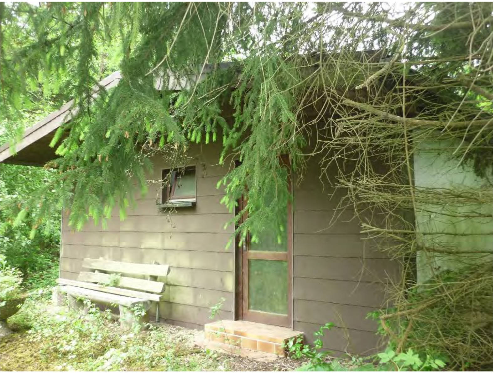 lfd. Nr. 1: Waldgrundstück, größtenteils unzugängig, mit Strauch und Baumbestand, kleinem Tümpel in der Mitte und einem seit Jahren ungenutzten barackenartigem Gebäude.