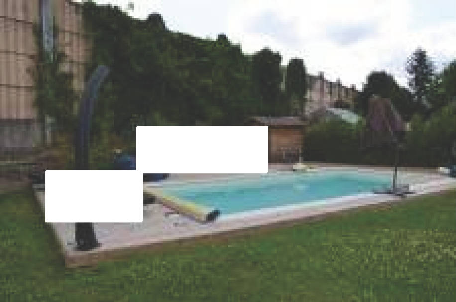 Außenbereich mit Pool, Terrasse, überdachter Terrasse, befestigten Flächen, Zaun, Hecken, Gartenanlagen, Einfriedung, Gerätehaus für Schwimmbadtechnik