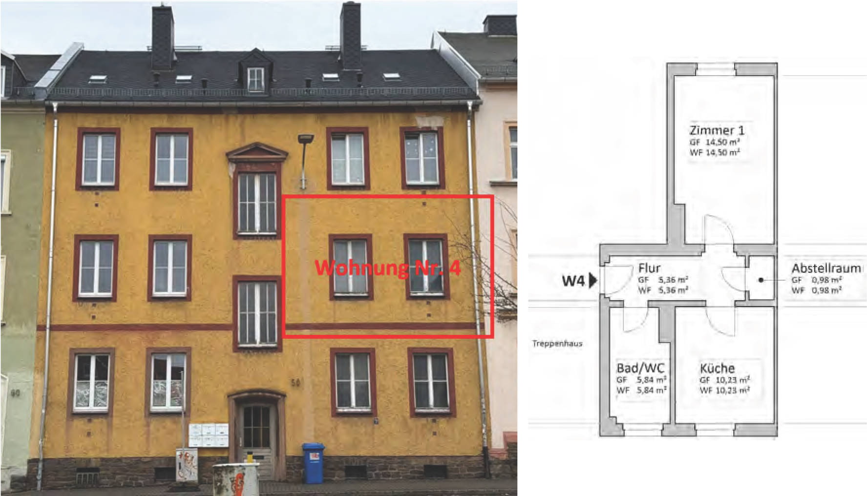 7 Tage kostenlos Testen1-Raum-Wohnung im 1. OG eines 3-geschoss. Mehrfamilienhauses mit insgesamt 6 WE; Wohnfläche: ca. 36,91 m²; Baujahr: 1956; modernisierungsbedürftig; bei Begutachtung nicht vermietet