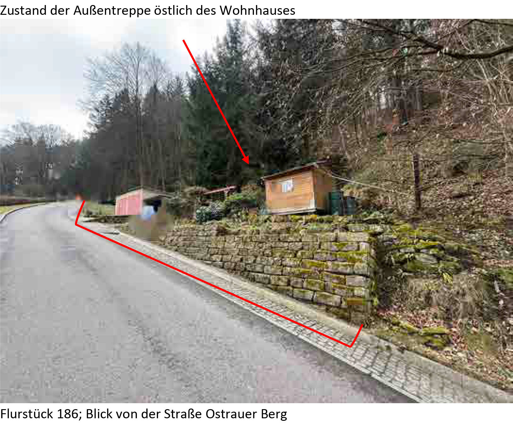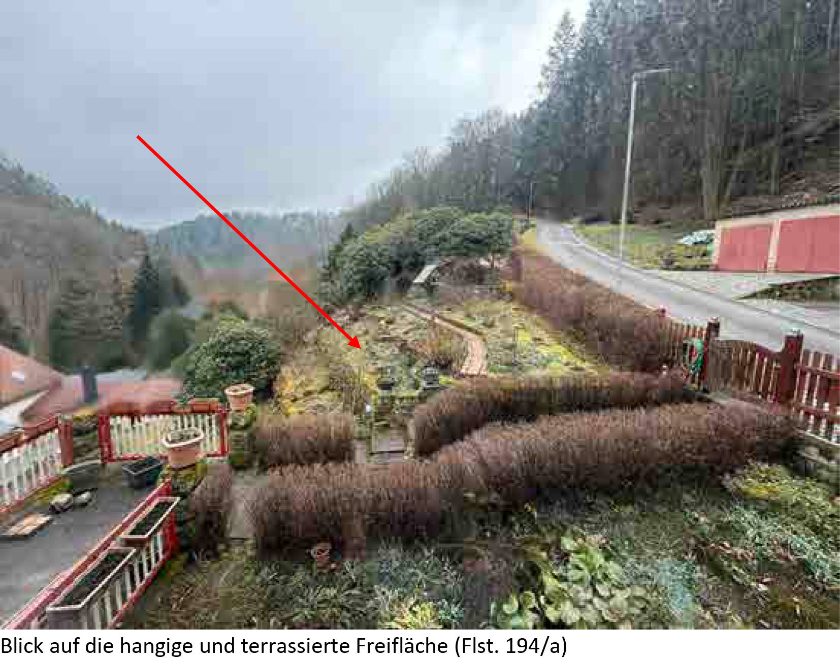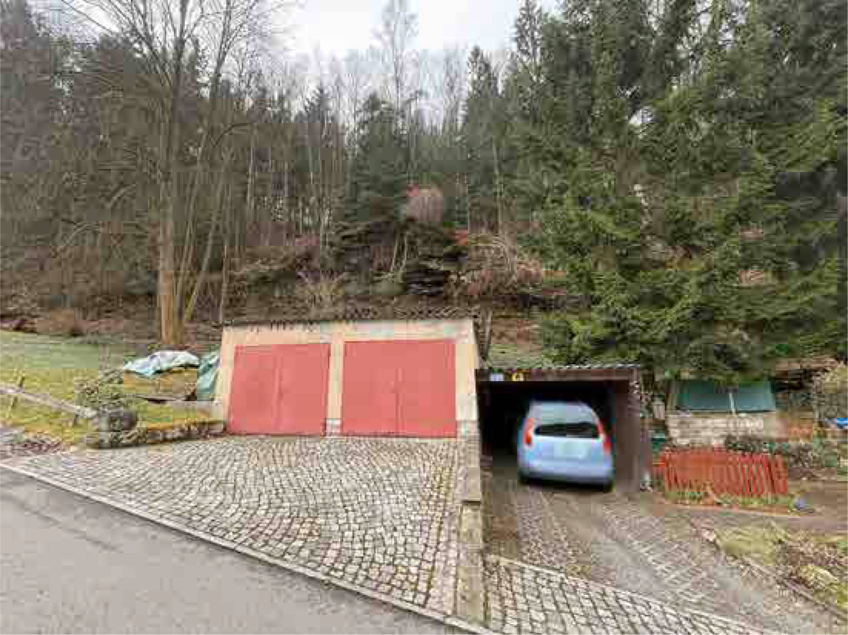 Flurstück: 186: bewaldetes Hangflurstück, bebaut mit Doppelgarage, Carport und Geräteschuppen