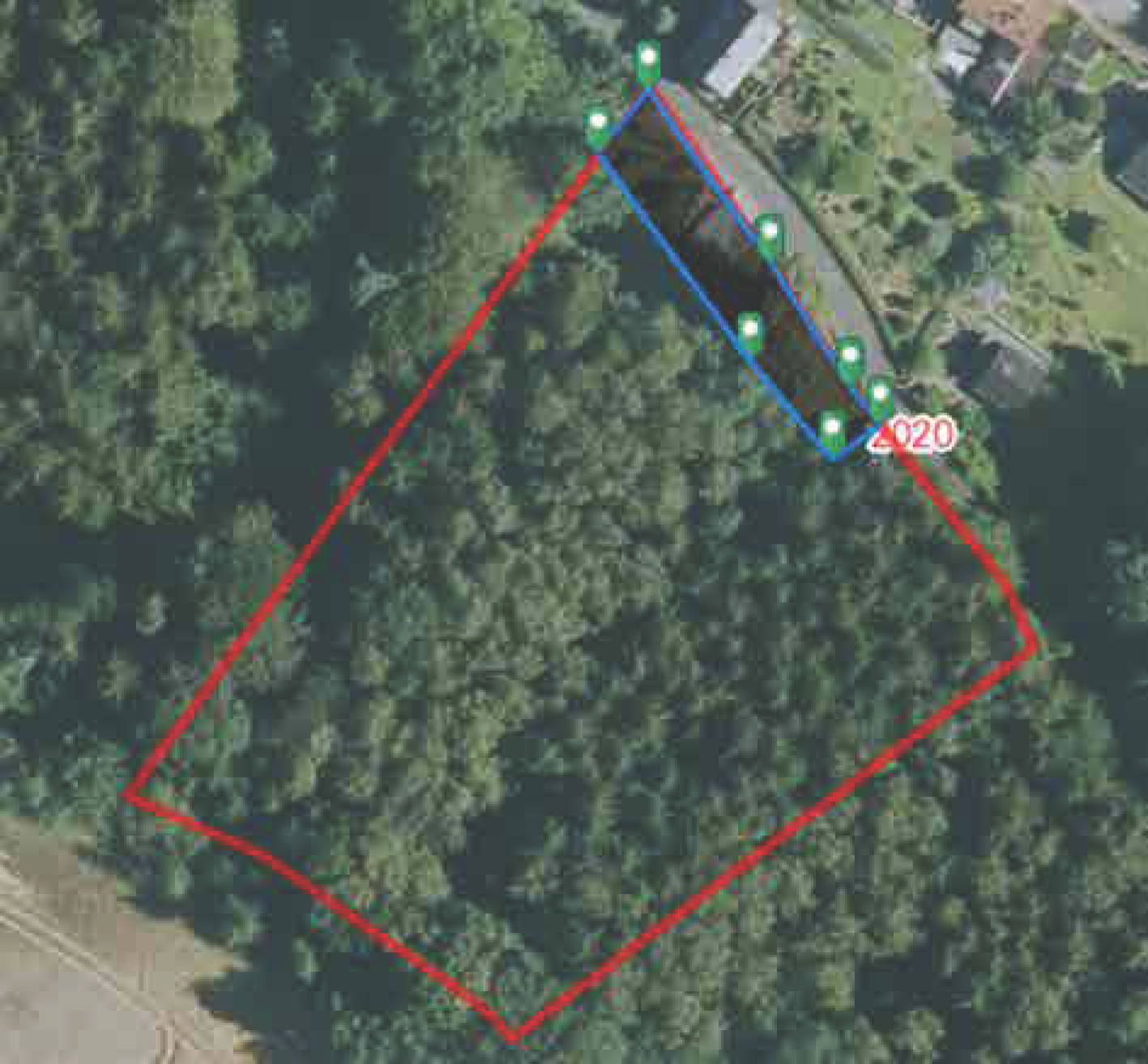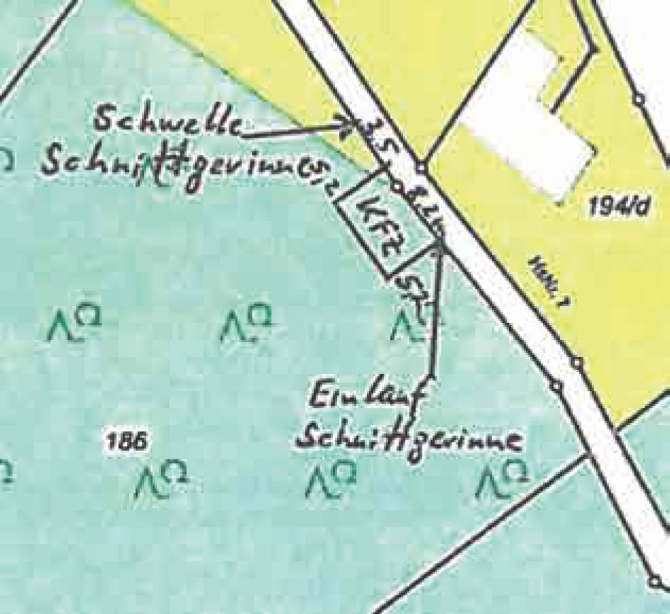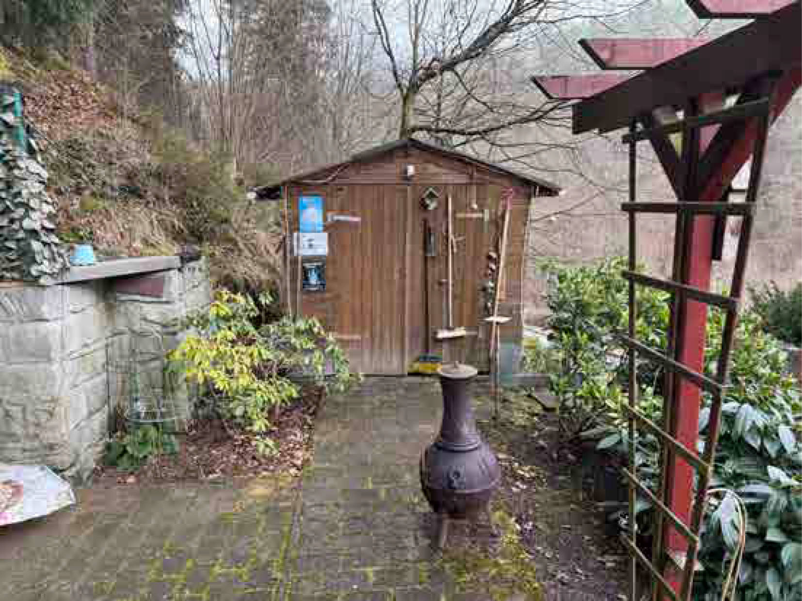 Flurstück: 186: bewaldetes Hangflurstück, bebaut mit Doppelgarage, Carport und Geräteschuppen