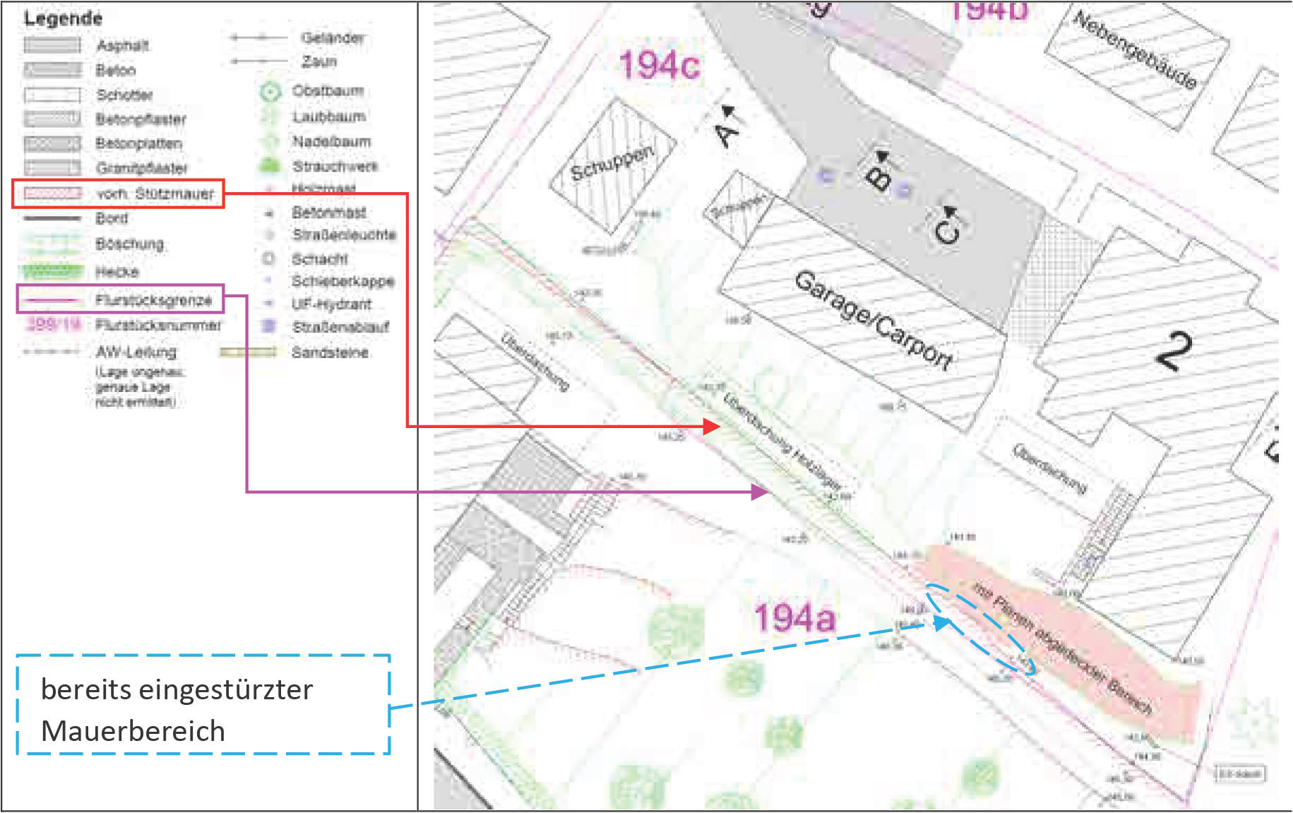 Flurstück 194/a: Flurstück bebaut mit Zweifamilienhaus, Baujahr geschätzt um 1900, Sanierung/Modernisierung teilweise nach 1990, ca. 179,65 m² Wohnfläche, instandsetzungsbedürftige und teilweise eingestürzte Stützmauer zum Nachbargrundstück Flurstück 194/c