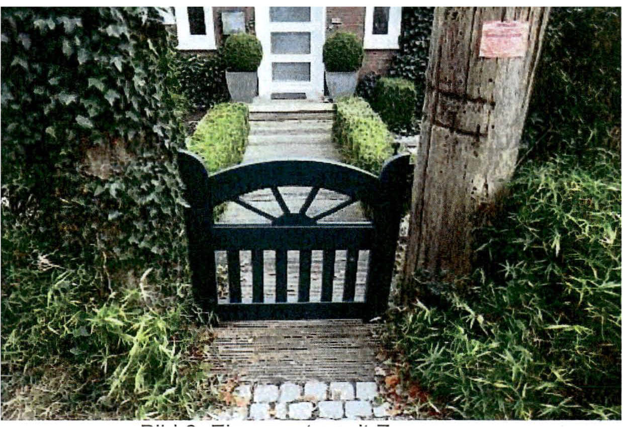 Das Einfamilienhaus ist ca. 6 m von der Erschließungsstraße Polterberg belegen, sodass ein Vorgarten vorhanden ist. Der Vorgarten ist mit kleinen Rasenflächen, Kiesflächen und Sträuchern angelegt. Die Zuwegung ist mit Terrassendielen befestigt und wird von einem einflügeligen Holztor gesichert. Das Bewertungsgrundstück ist von einer Ligusterhecke eingefasst.