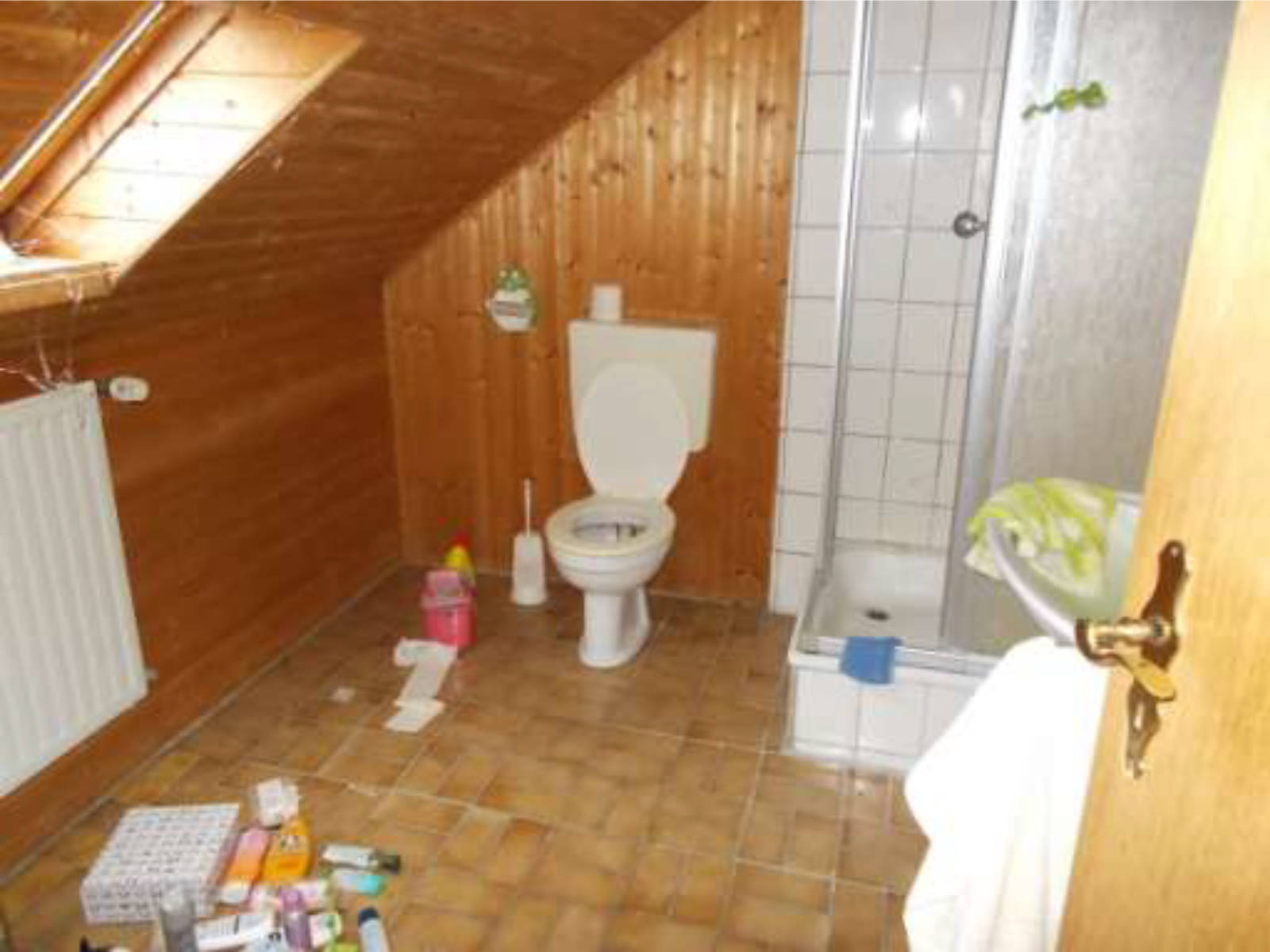Bad: Waschbecken, Dusche mit Kabine, Stand-WC mit Spülkasten