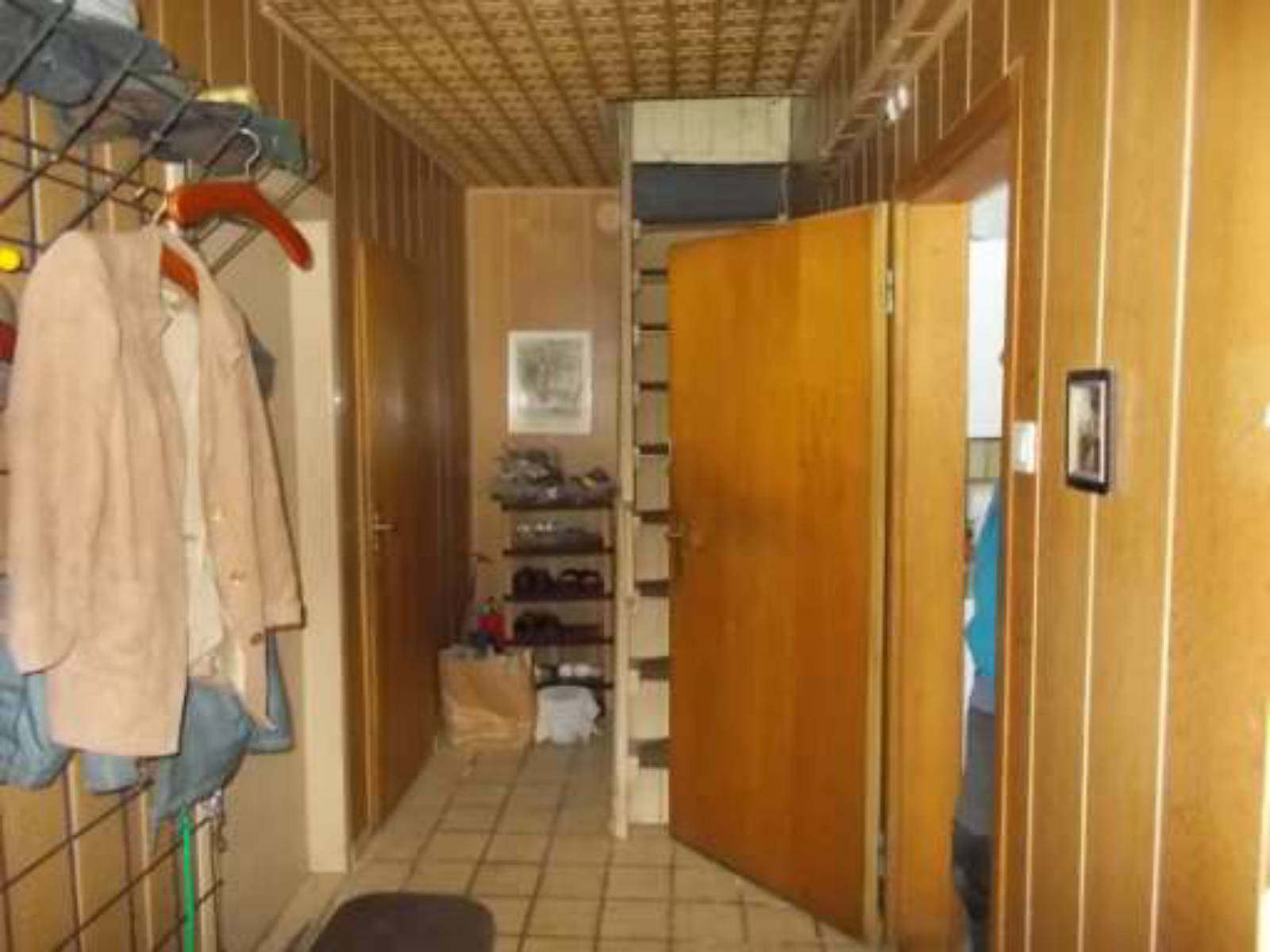 Wandverkleidungen: Profilholzverkleidung, Tapeten; Bad, Küche: Fliesenschild