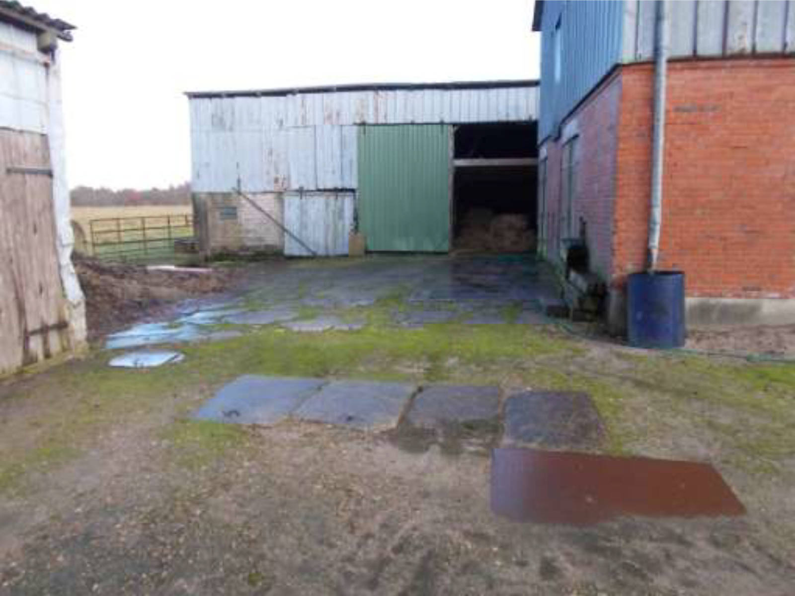 Die nicht überbauten Flächen im Bereich der Gebäude sind mit einfachen Befestigungen angelegt. Insgesamt befinden sich die Gebäude und die Freiflächen vorwiegend in einem ungepflegten und vernachlässigten Zustand. Die nördlich und östlich von den Gebäuden liegenden Grünlandflächen sind überwiegend mit Grasbewuchs versehen.