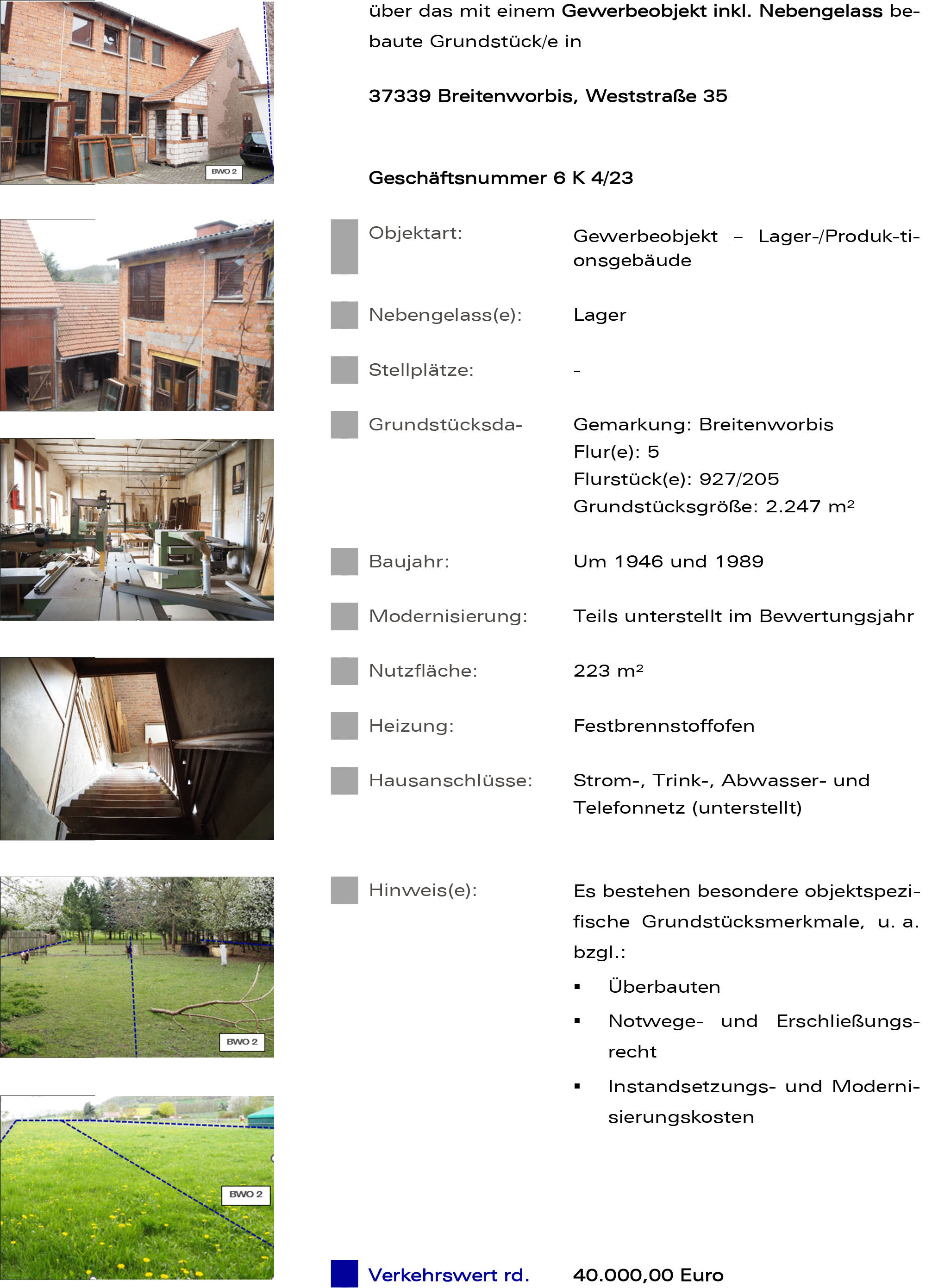 7 Tage kostenlos TestenObjekt 1: Grünland, Rohbauland Die Einsichtnahme in das Gutachten wird empfohlen. | Objekt 2: Gewerbeobjekt mit Nebengelass und Grünland Instandhaltungsstau Die Einsichtnahme in das Gutachten wird empfohlen. | Objekt 3: Einfamilienhaus mit Einliegerwohnung, Nebengelass und Grünland. Instandhaltungsstau Die Einsichtnahme in das Gutachten wird empfohlen. | Objekt 4: überbaute Fläche der Flurstücke 927/05 und 928/06 Die Einsichtnahme in das Gutachten wird empfohlen.